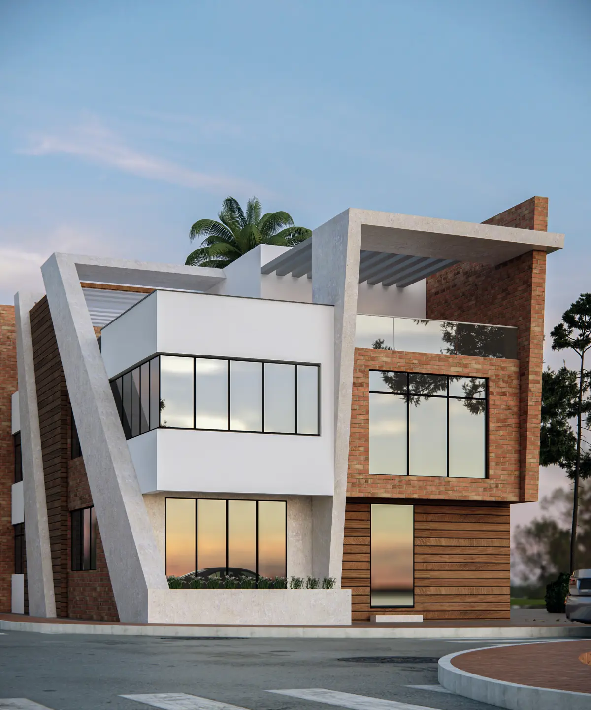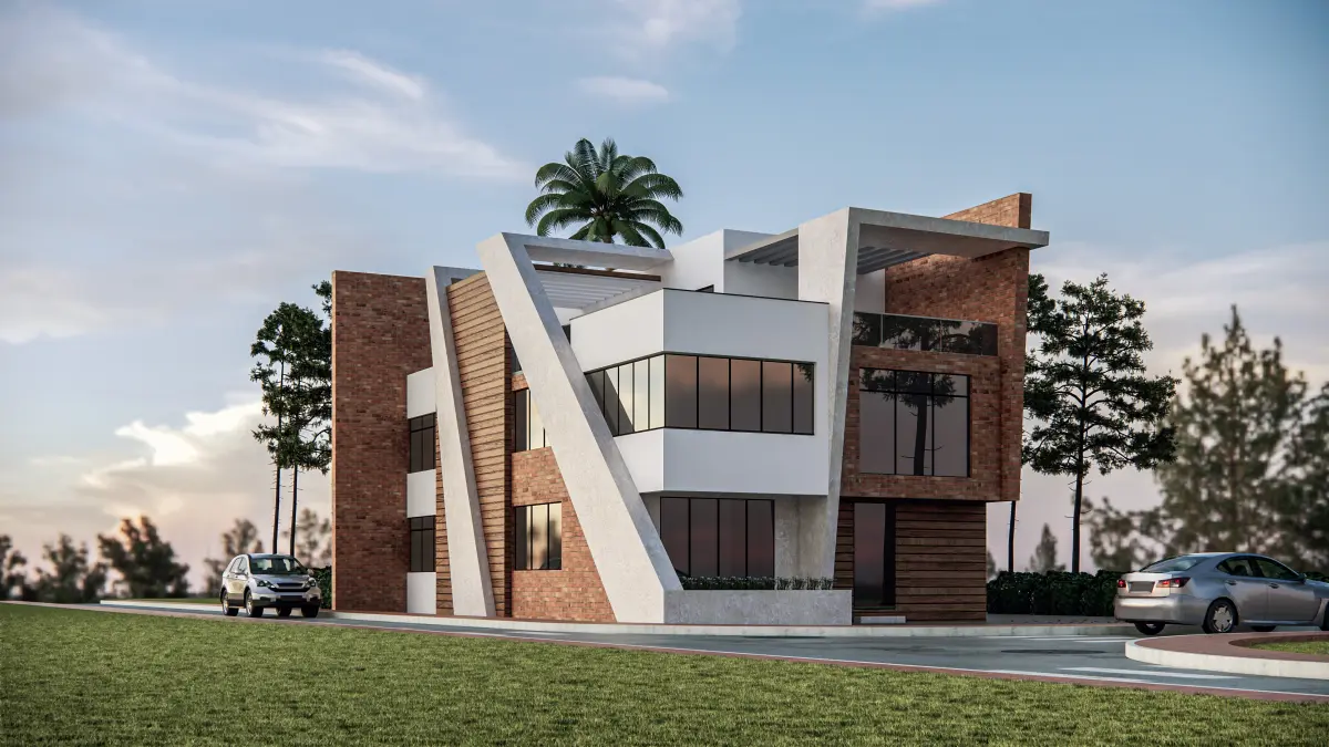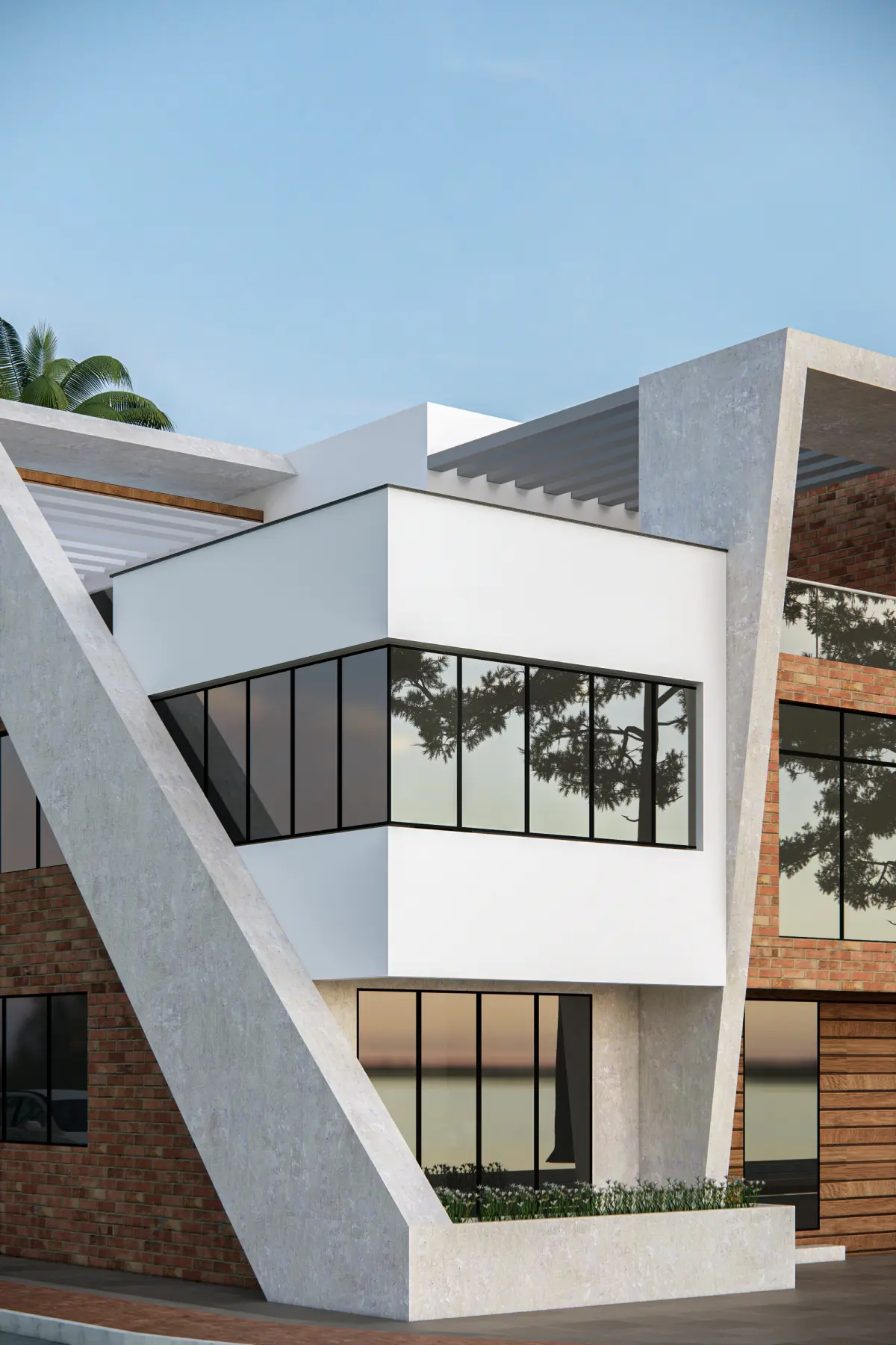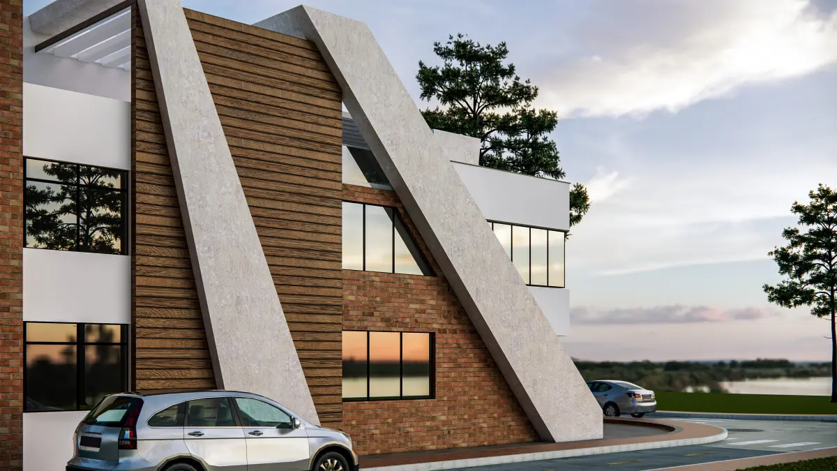 - Elegant Material Palette: A clean blend of vertical wood paneling, concrete textures, and aluminum framing enhances realism and architectural appeal.