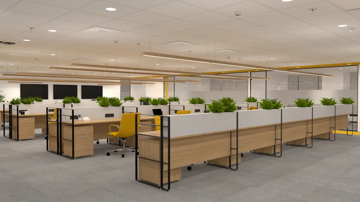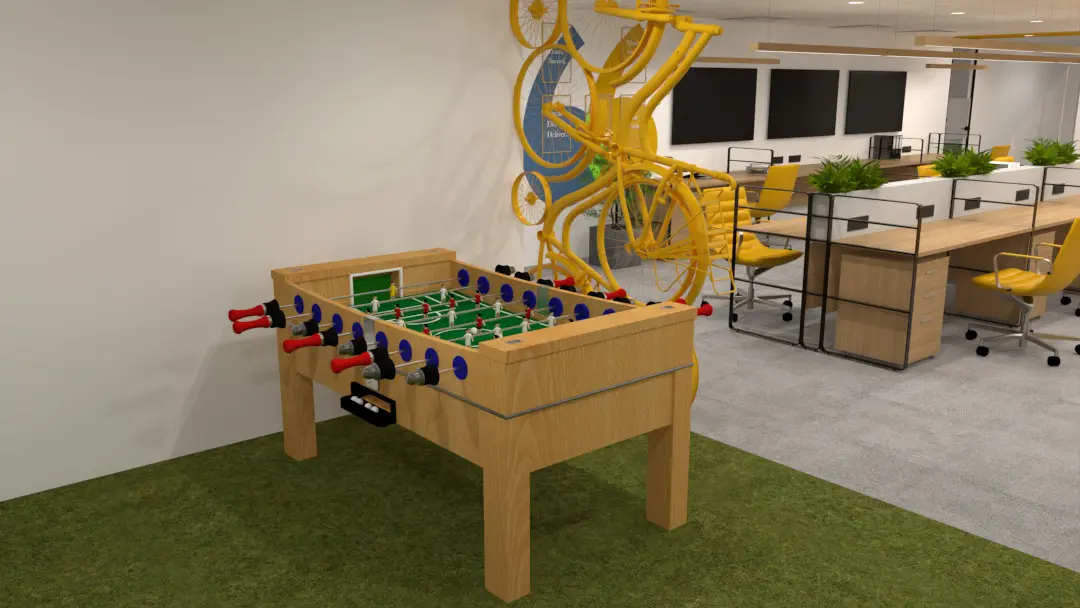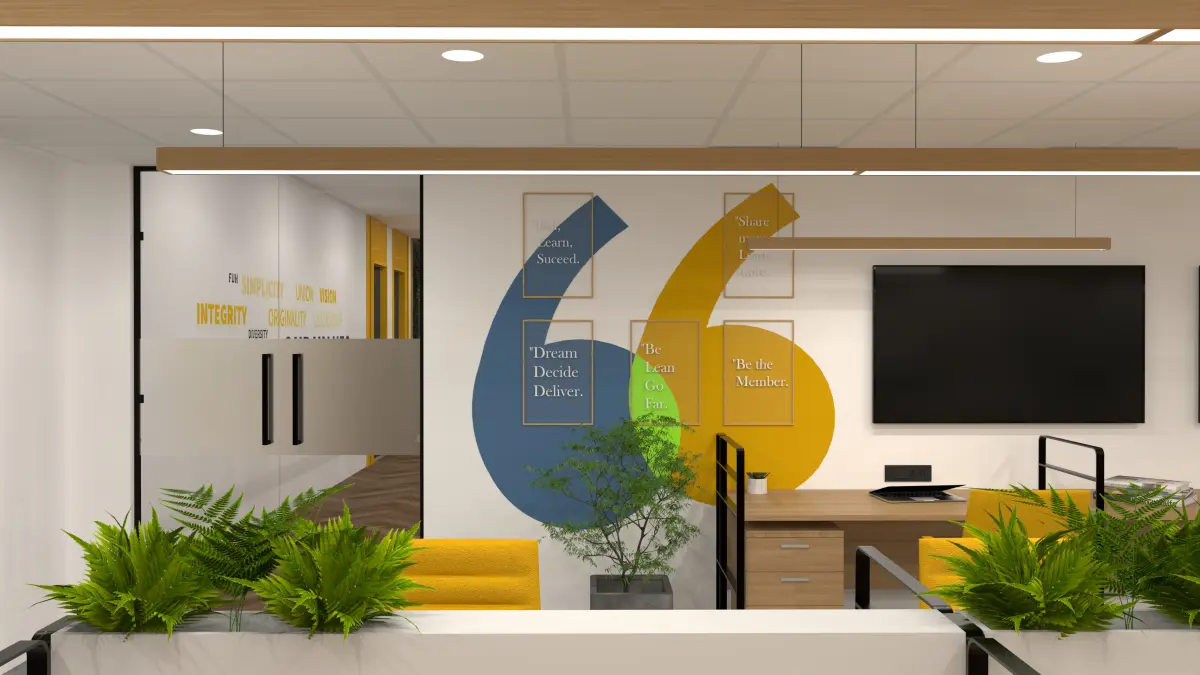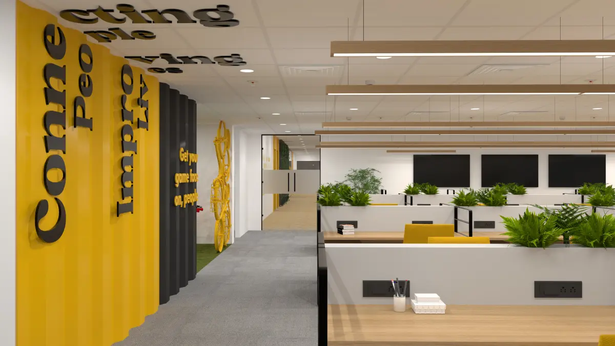 Modern office interior of the shipping company. Clean interior with bright colour combination.Content: Passage area, workstation, game zone, container panel, wall graphics, green wall, glass partition.