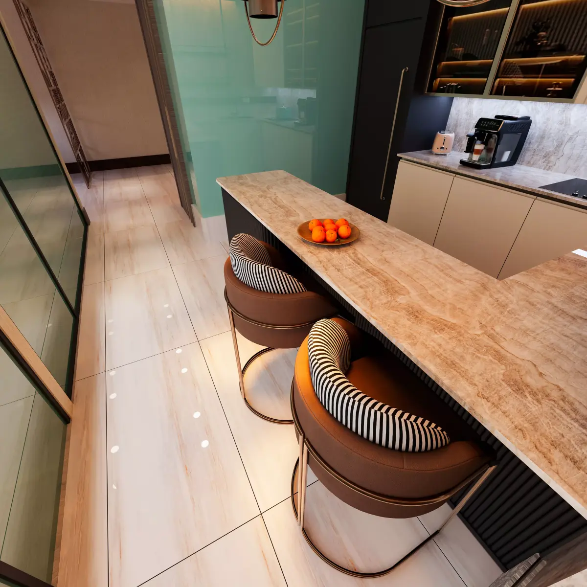 - Only built-in kitchen modules, including cabinets and shelves, and the chair are provided.