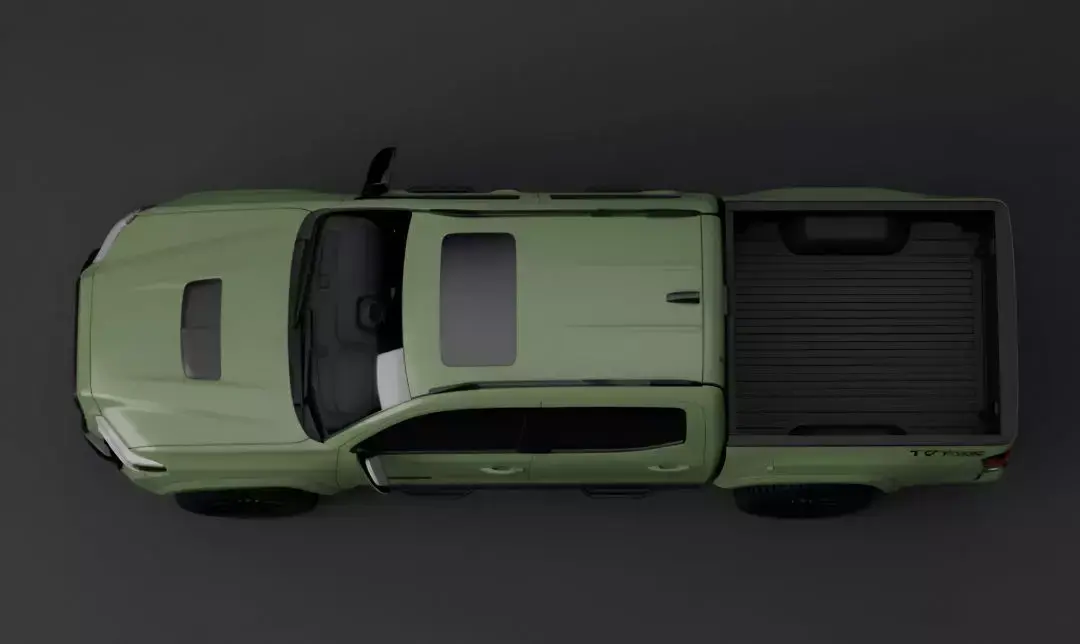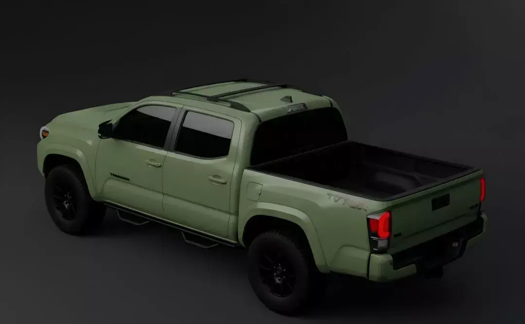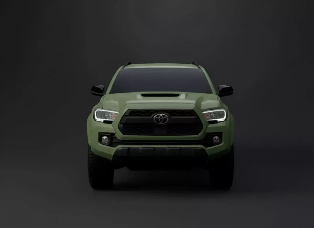 This image showcases the front view of a modern olive green Toyota Tacoma pickup truck, presented against a dark, minimalist background. The truck features bright, distinct LED headlights flanking a bold, honeycomb-patterned grille with the Toyota emblem at its center. Its aggressive front bumper includes auxiliary lights, emphasizing its robust, off-road readiness. The hood has a prominent scoop, adding to its sporty and powerful aesthetic. The symmetrical angle highlights the truck's strong lines and commanding presence.