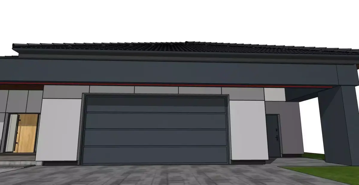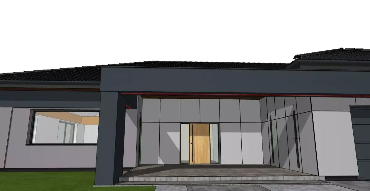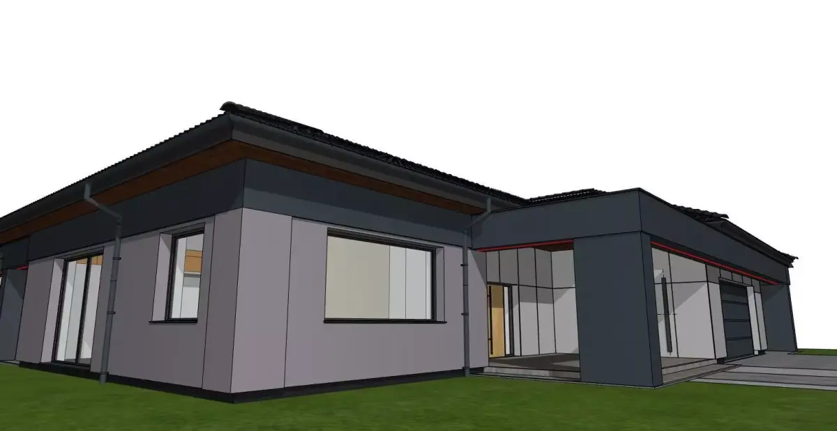 A realistic 3D model of a modern single-family house with a functional layout and clean architectural form.The design features a spacious terrace under a covered pergola, large glazing, and simple geometry emphasizing modern elegance.