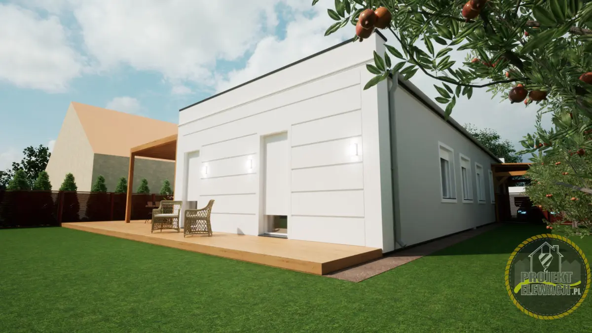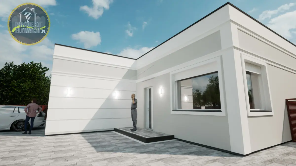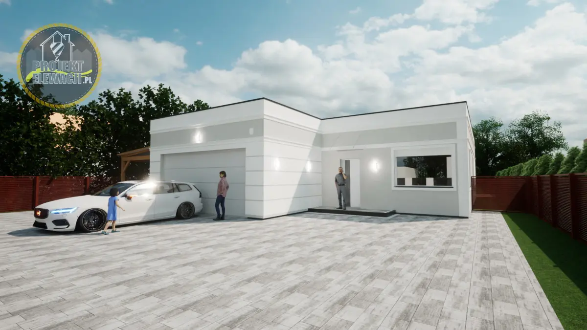 A model of a modern single-family, one-story house made as an external body. The model has a full body visible on the visualization as well as car lights, driveway and fence. The model does not include the environment such as grass, trees, vehicles or people.