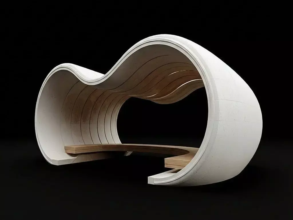 Add a touch of sophistication to your architectural projects with this Modern Organic Bench. Featuring a seamless infinity-loop design, this seating unit combines a sleek white outer shell with a warm wooden inner lining, creating a perfect balance between futuristic minimalism and natural comfort.