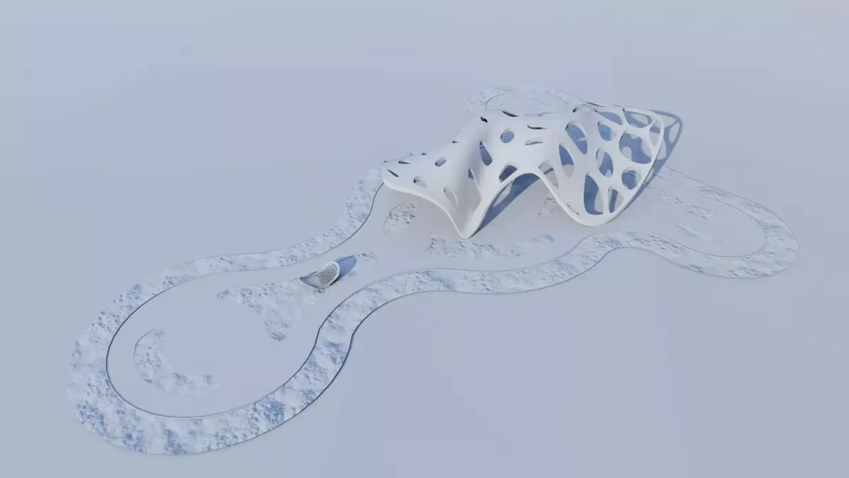 Integrated Seating: The base includes a seamlessly incorporated curved bench or seating element that flows directly from the structure's foundation.