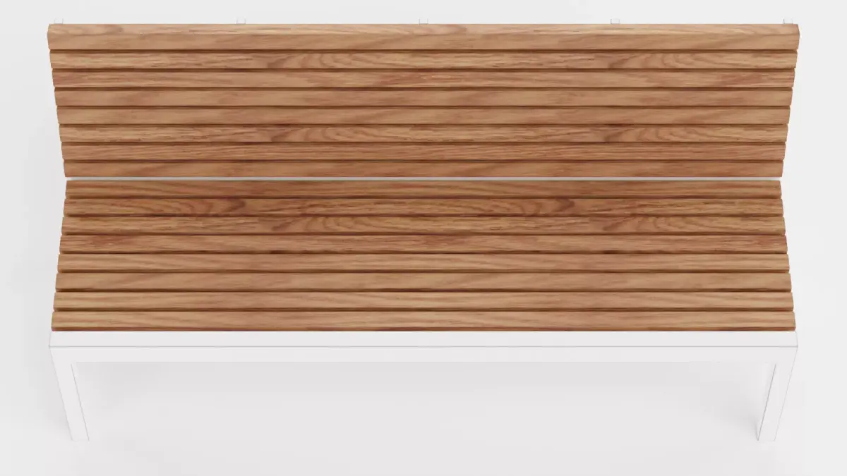 A classic outdoor bench combining white metal supports with wooden slats on both the seat and the backrest. The form follows a familiar public-space layout, supported by realistic wood detailing and clean proportions. The overall design stays neutral and practical.