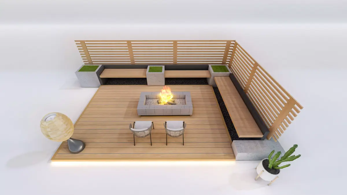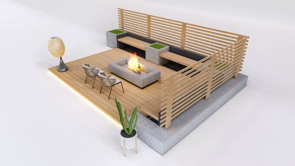This 3D model presents a sleek and inviting outdoor living space, featuring a modern deck with a multi-level design. The centerpiece is a realistic fire pit, perfect for creating a cozy, high-end atmosphere. The space includes integrated concrete planters and slatted wooden screens that offer both privacy and a contemporary aesthetic. A built-in bench and a small seating area with modern chairs provide versatile options for relaxation and social gatherings.