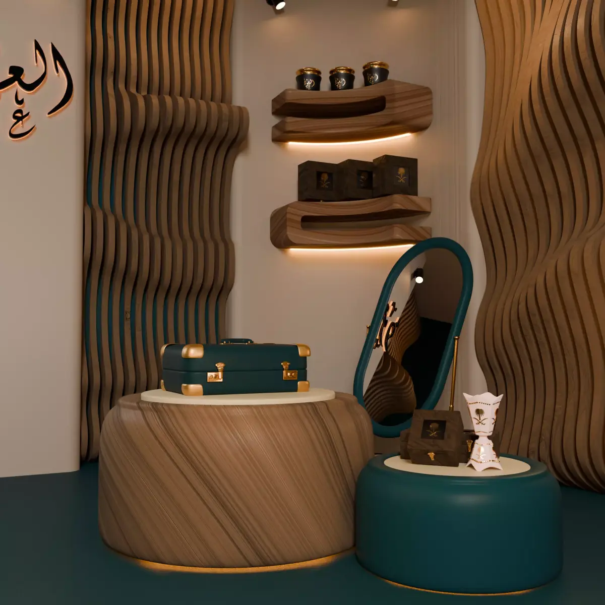 - Parametric wooden wall panels with smooth, flowing curves for a premium aesthetic.-Custom-designed display shelves for showcasing oud bottles and gift boxes.-Curved reception counter with modern panel detailing.