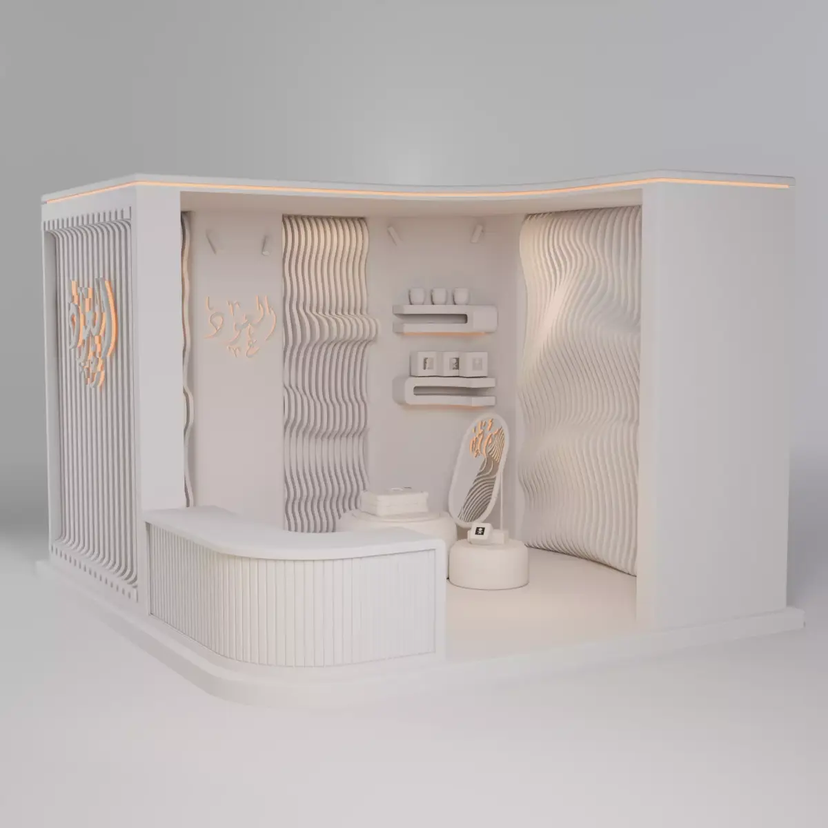 This high-quality 3D model represents a luxury exhibition booth designed for showcasing oud and oriental perfumes. Featuring organic parametric wooden waves blended with modern minimal elements, this booth creates an elegant and inviting atmosphere ideal for trade shows, retail displays, or event branding._The booth design includes:
