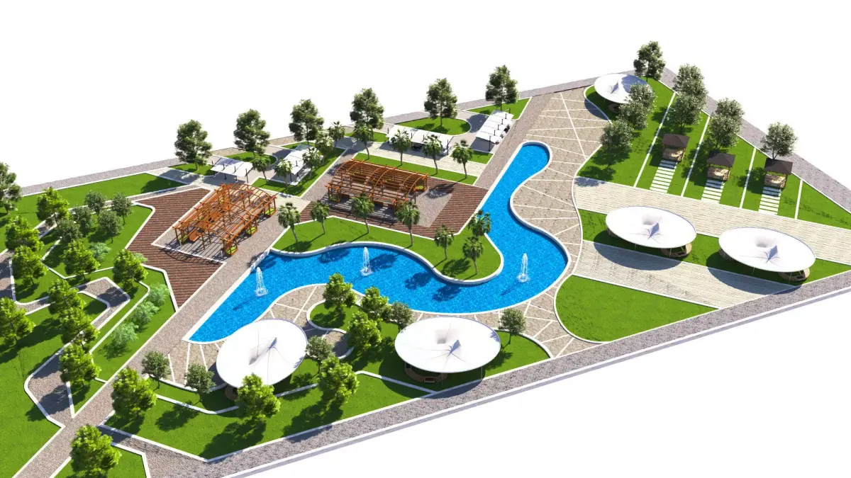 Architectural Details: The model includes realistic park structures like shaded canopies, a gazebo, and contemporary lighting fixtures, all designed with clean, modern lines.