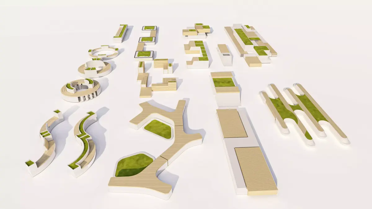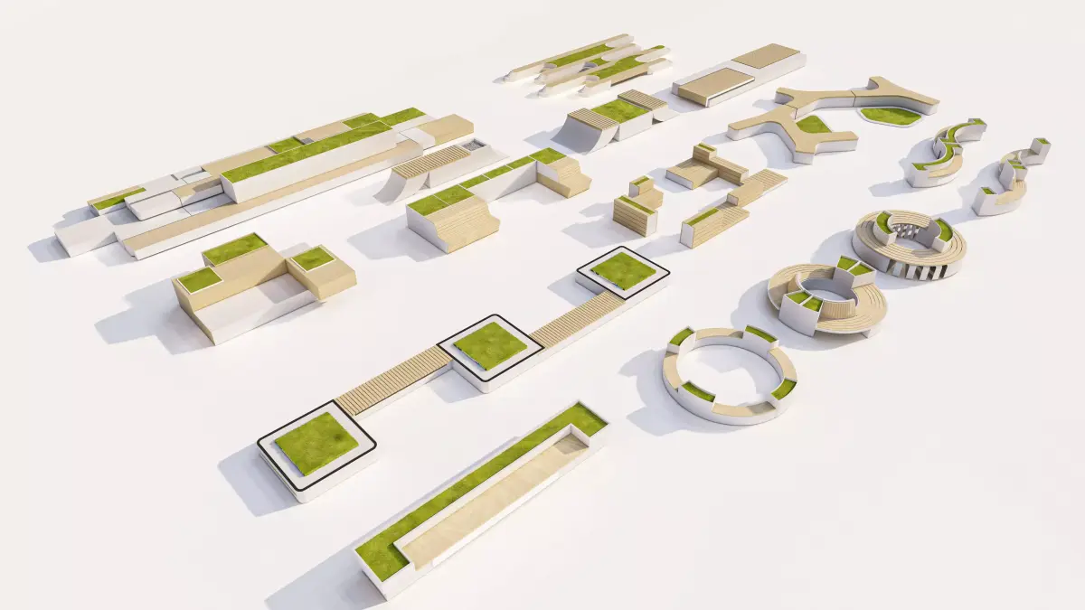 Architectural Shapes: The collection also includes large, purely architectural elements such as stair-stepped seating blocks, raised platforms, and long angular dividers that define pathways and transition between levels.