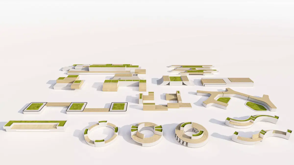 Modular Benches: Features a wide variety of benches, including straight, curved (concave and convex), circular, and flowing wave shapes. These benches utilize a core white or light concrete structure with smooth light-colored wooden seating slats integrated into the design.