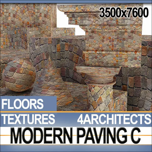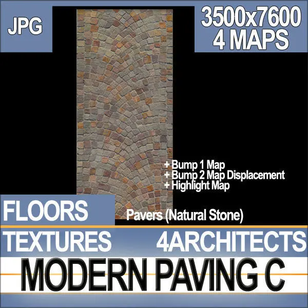 In the package you will find:1- Texture Seamless Modern Paving C [3500x7600];2- Modern Paving C Bump 1 MAP [3500x7600];3- Modern Paving C Bump 2 MAP [3500x7600], ready for Displacement;4- Modern Paving C Highlight MAP [3500x7600].