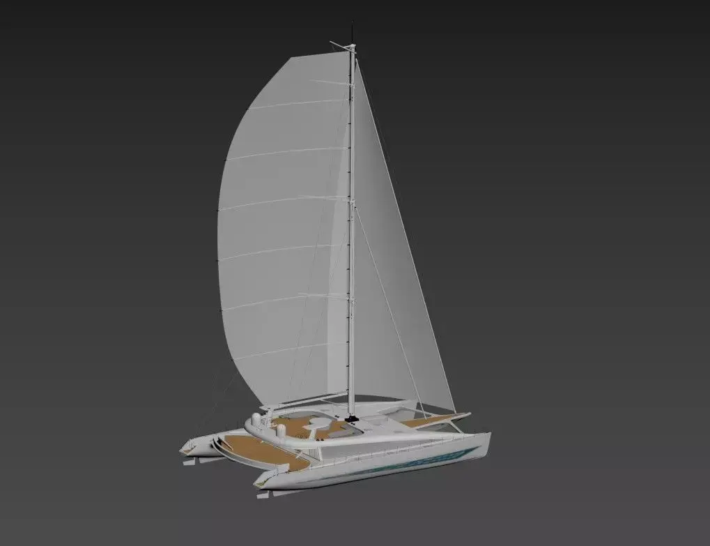 Wide twin hulls providing exceptional stability and spacious deck areaLarge modern square-top mainsail on a tall carbon-style mast with full standing and running riggingExpansive aft cockpit with helm station, seating areas, and realistic teak flooringForward trampoline netting and clean minimalist deck layoutStreamlined design optimized for both performance and comfort