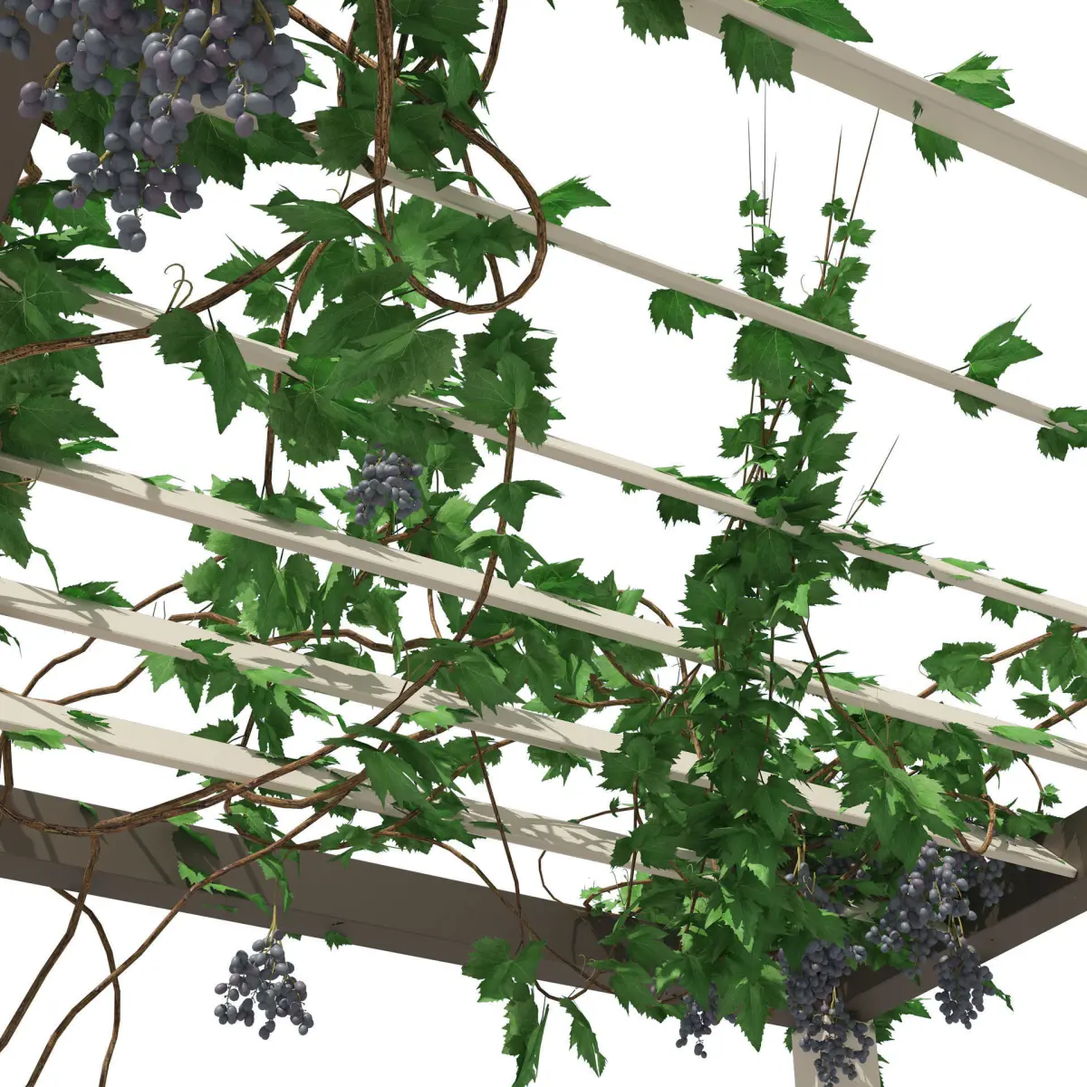 Highly detailed 3d model of modern outdoor pergola with table and chairs furniture, climber grape vine and wood deck, ready to use for garden, backyard, swimming pool area, landscape, Japanese garden and exterior environment projects design.