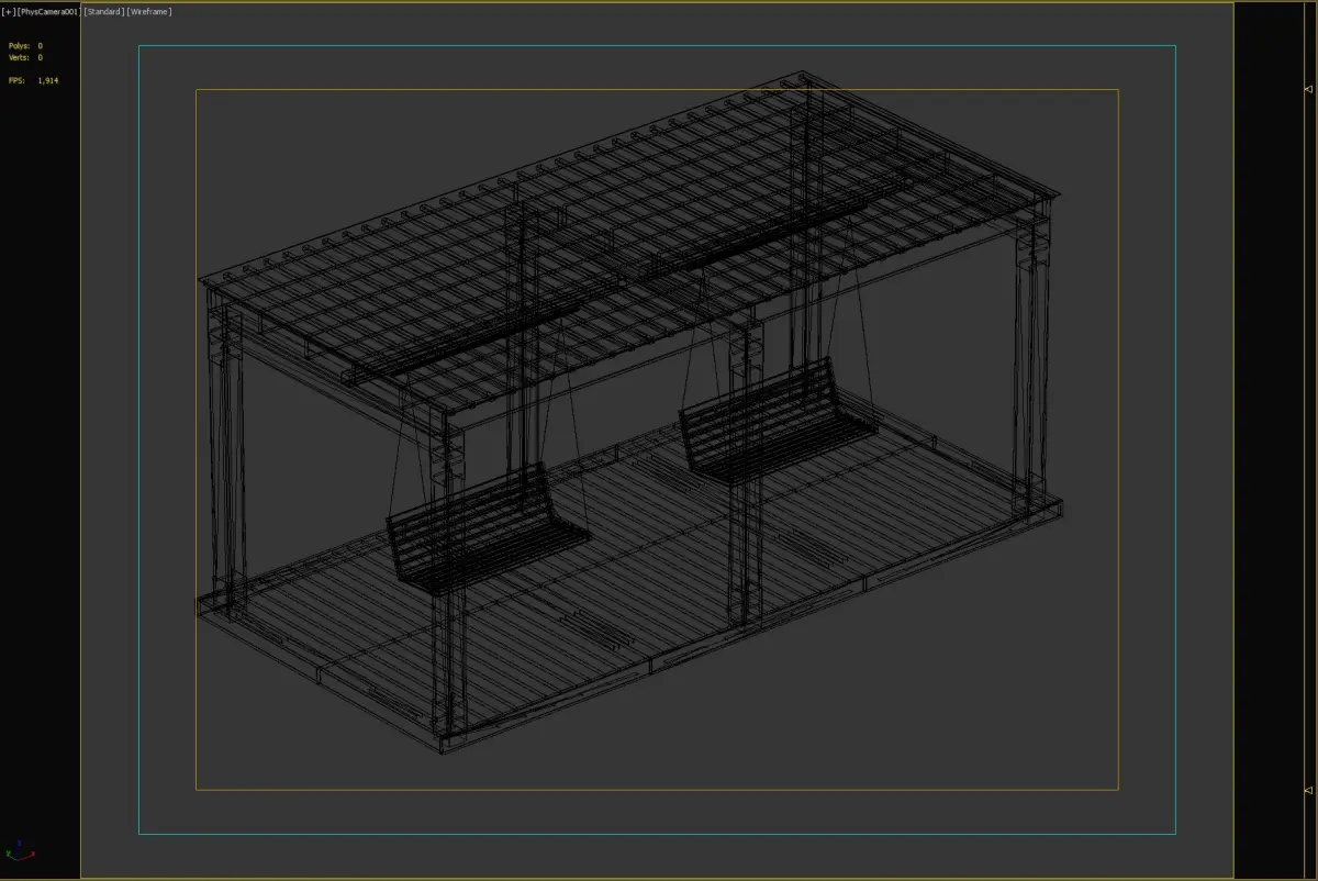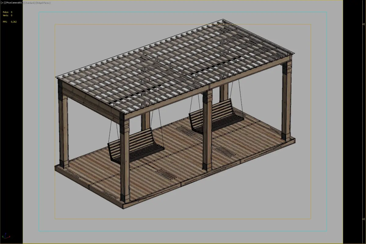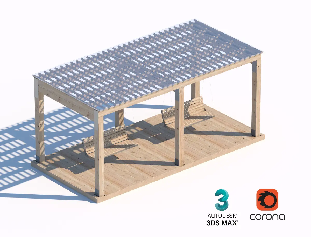 Stylish pergola with two wooden swings, perfect for outdoor relaxation areas. Ideal for parks, gardens, and backyard setups.