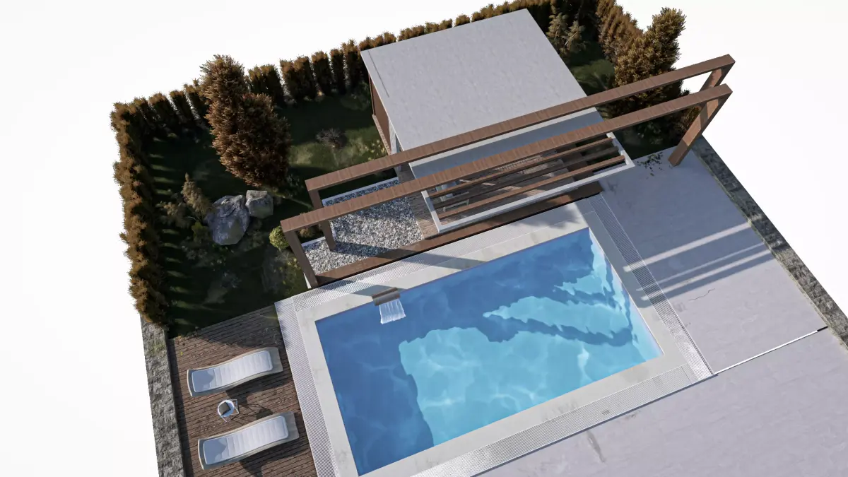 This is a fully detailed modern pool lounge and gazebo 3D scene, designed for architectural visualization and exterior rendering.The entire model was created in 3ds Max and finalized in Lumion, using only Lumion’s native material library — no external textures were imported.The scene is completely ready-to-render in Lumion, with all materials, vegetation, lighting, and camera setups prepared for immediate use.