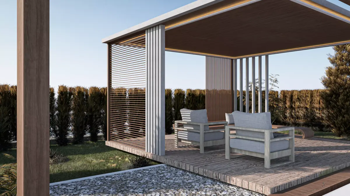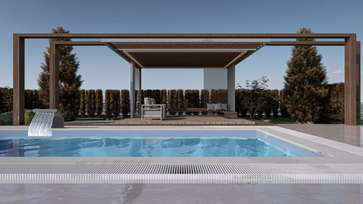 Fully modeled modern outdoor lounge area with pool and gazebo