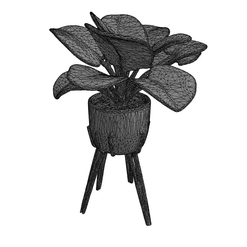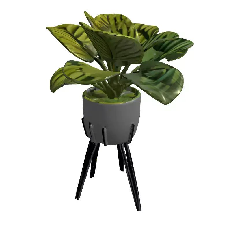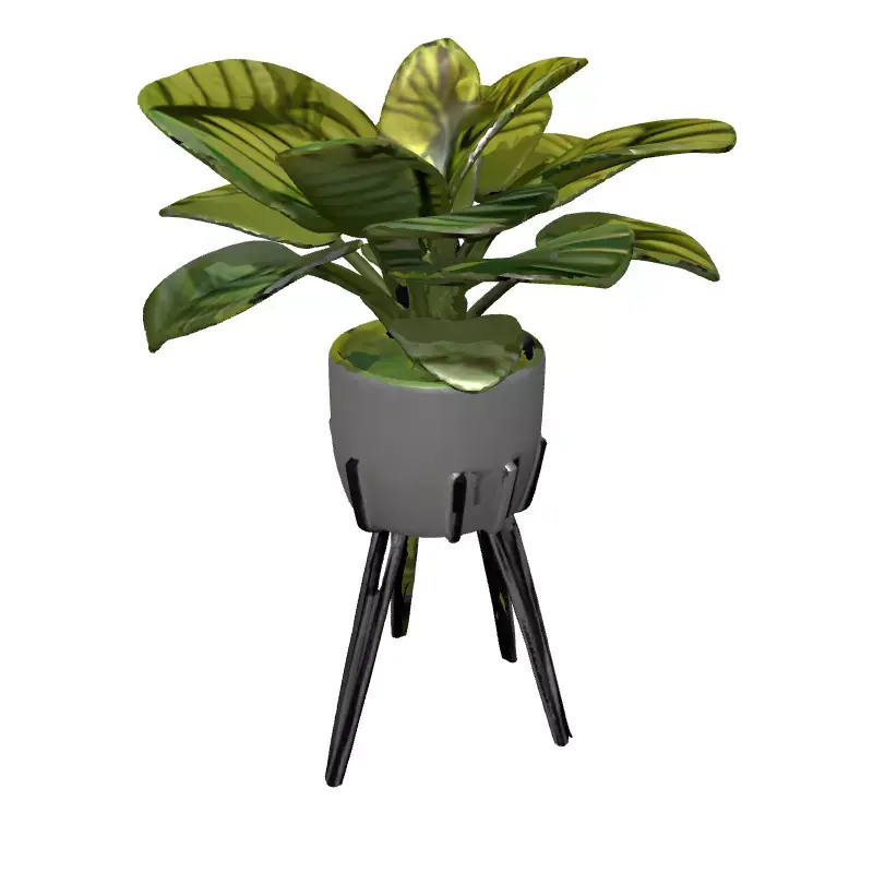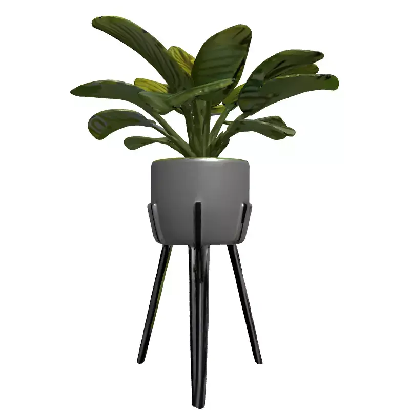 This highly detailed 3D model presents a modern potted houseplant, ideal for enriching any interior visualization or virtual environment. The model features a lush, broad-leaf plant, reminiscent of a Strelitzia or a similar tropical species, meticulously crafted with realistic foliage textures and subtle color variations, including a distinctive variegated leaf. It is elegantly housed in a clean, contemporary cylindrical pot, which is supported by a sleek, minimalist black metal stand with three sturdy legs. This versatile asset is perfect for architectural visualization projects, adding a touch of natural elegance to living rooms, offices, or commercial spaces. It is also well-suited for game development as a realistic prop, populating AR/VR experiences, or as an element in digital art compositions. The model boasts clean topology and is efficiently UV unwrapped, ensuring seamless texture application. With physically based rendering (PBR) textures, it delivers stunning visual fidelity under various lighting conditions, making it suitable for both real-time applications and high-quality static renders. Ready for integration into your next project, it supports a wide array of popular 3D file formats, including GLB, OBJ, STL, ABC, DAE, FBX, USD, and PLY, providing maximum compatibility and ease of use. Its optimized geometry ensures smooth performance in interactive scenes while maintaining excellent visual quality.