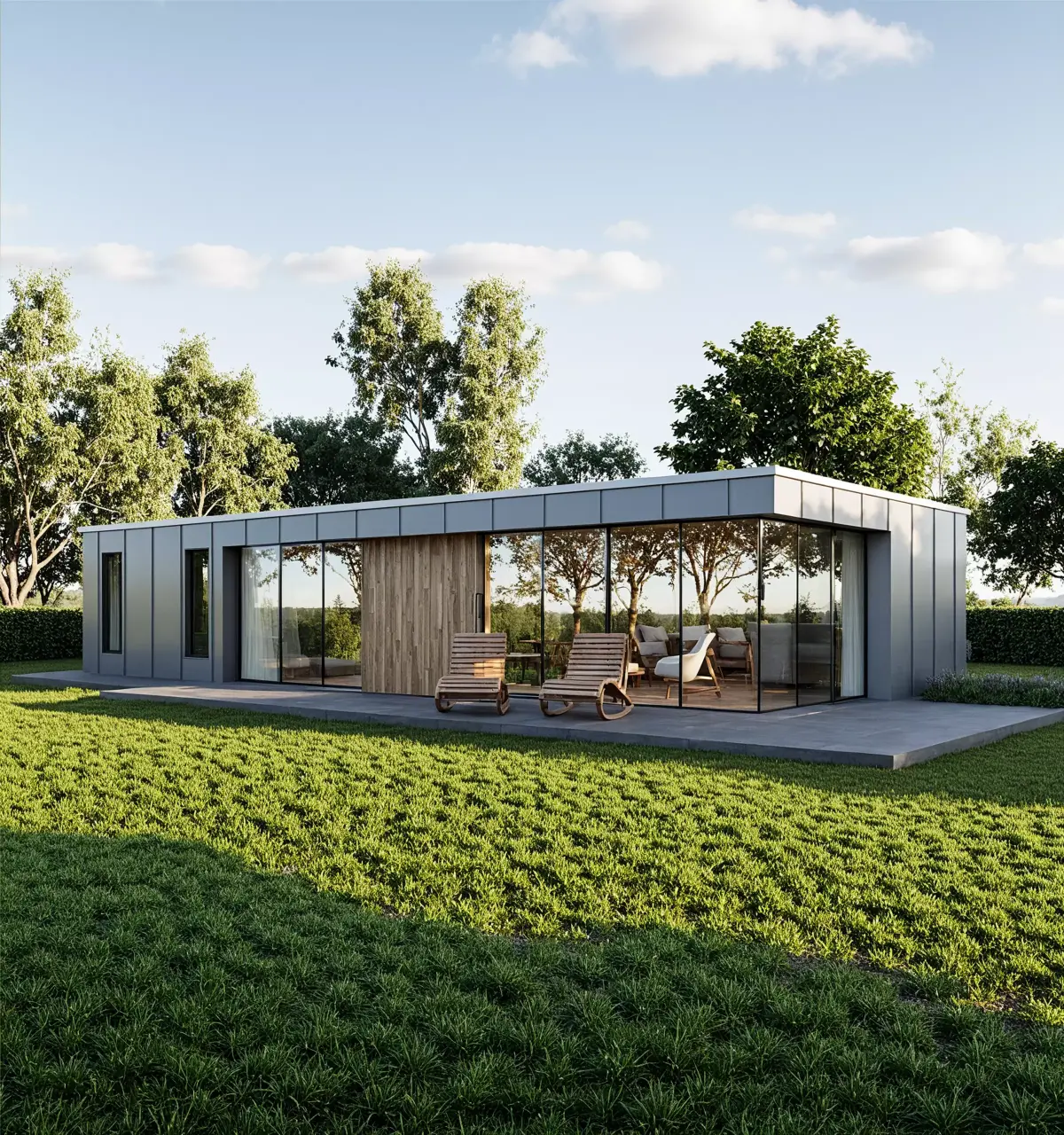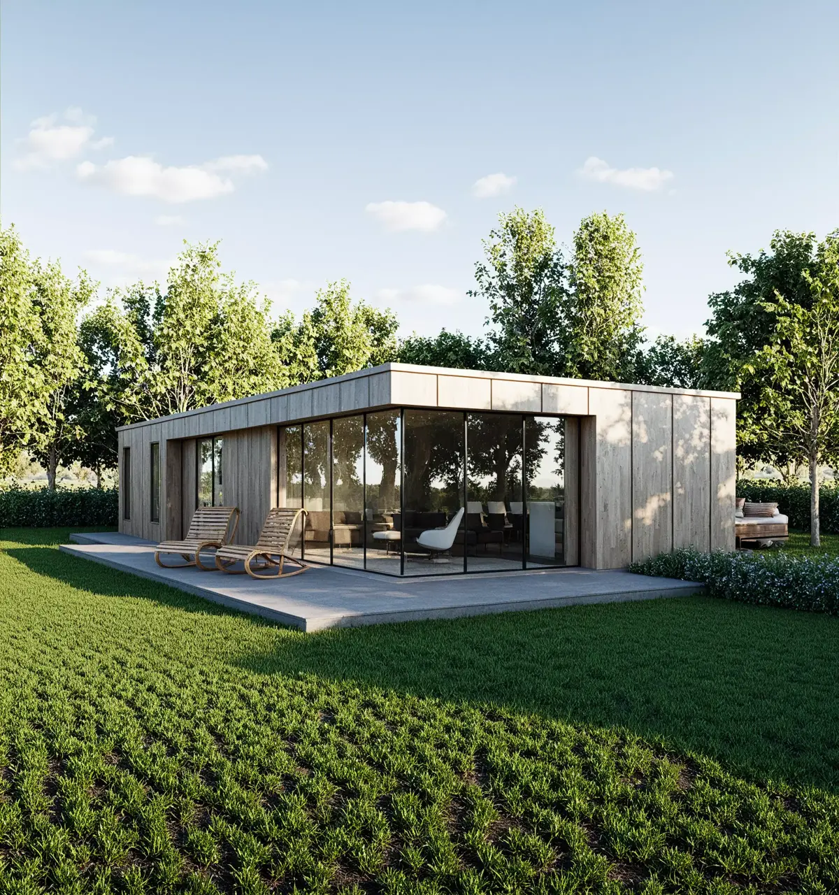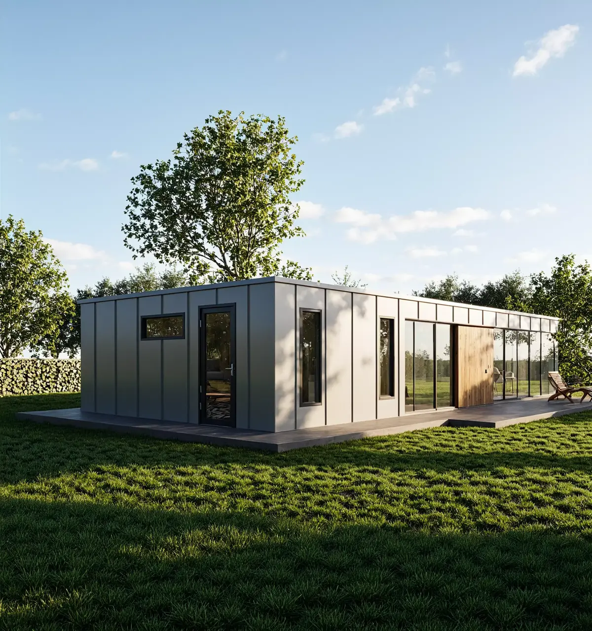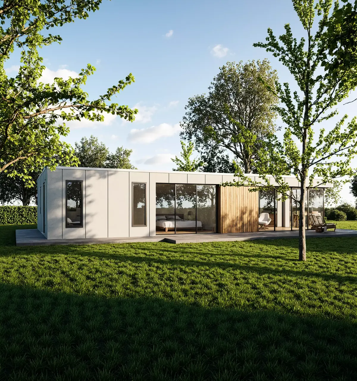 This modern prefab tiny house 3D model showcases a sleek, minimalist design with a flat roof, wooden cladding, and large glass panels.It’s ideal for architectural visualization, BIM coordination, and concept design presentations.