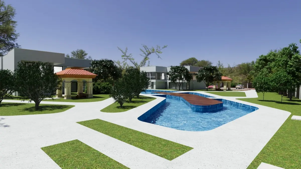 Highly detailed 3d scene of large, modern housing and residential complex. the complex are multifunctional as residential, motel or tourist complex. The complex consists of multiple apartment buildings arranged in a U-shape around a central courtyard. The buildings are two or three stories tall and have white stucco walls. The courtyard is landscaped with trees, grass, pergola and swimming pools. There is also a parking lot for renting.