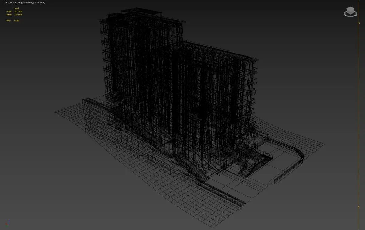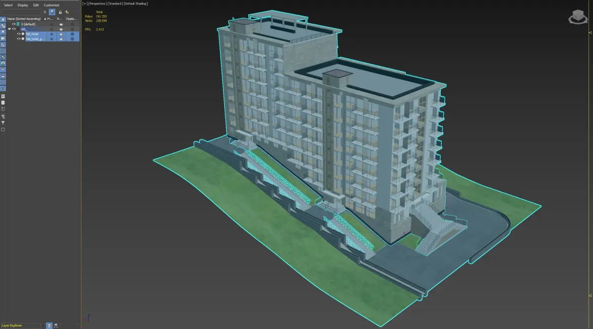 A detailed 3D model of a modern multi-story residential building with balconies, ground-level entrances, and integrated terrain. Ideal for architectural visualization and urban planning projects.