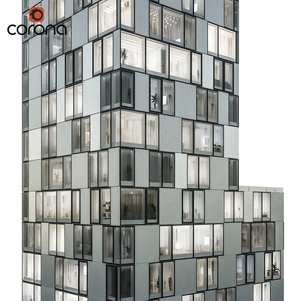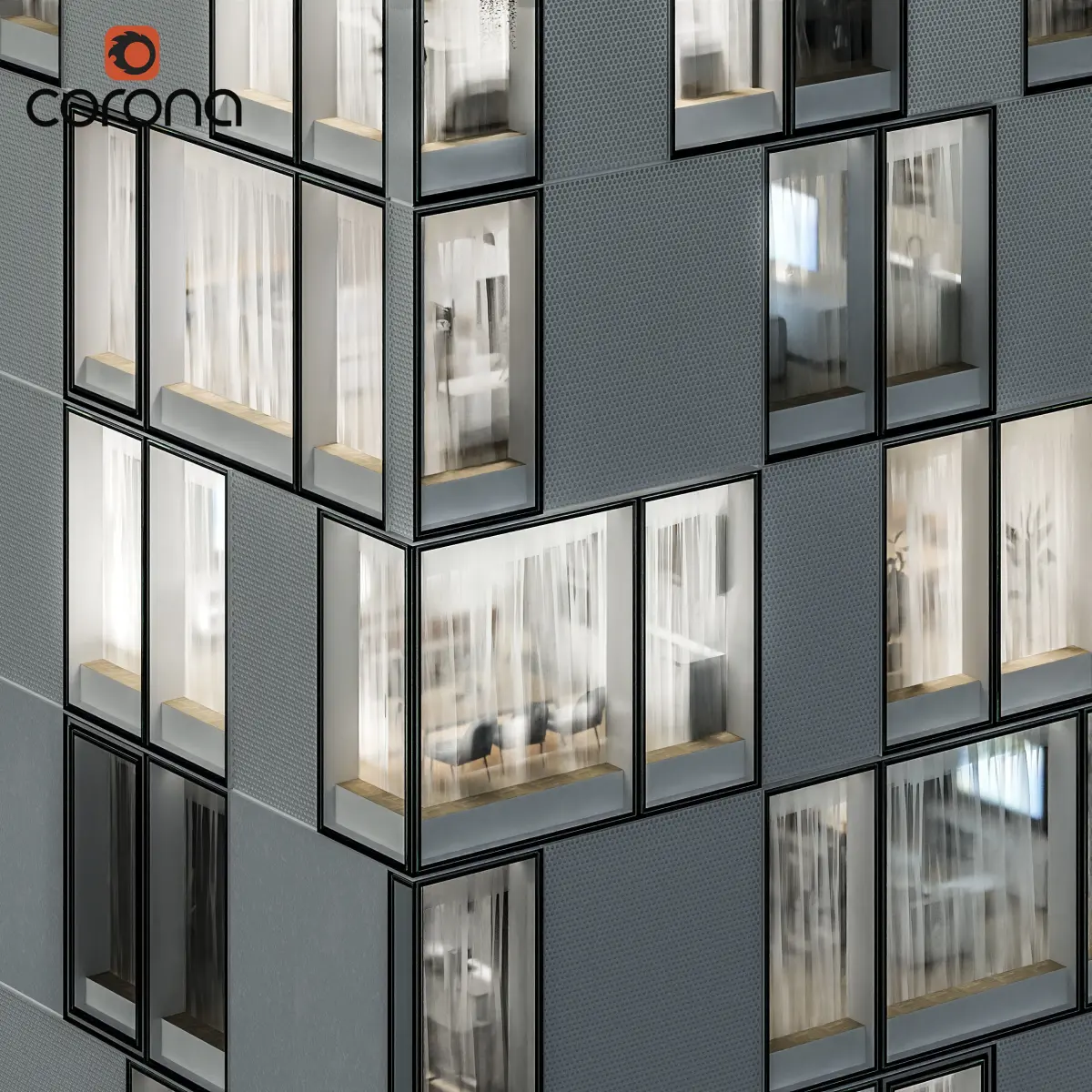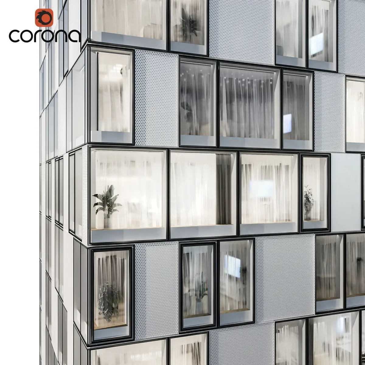 Interiors are 3-dimensional (walls) with various furniture as textures on planes (plants, lamps, kitchens etc.) and with most lights on (for night renders).