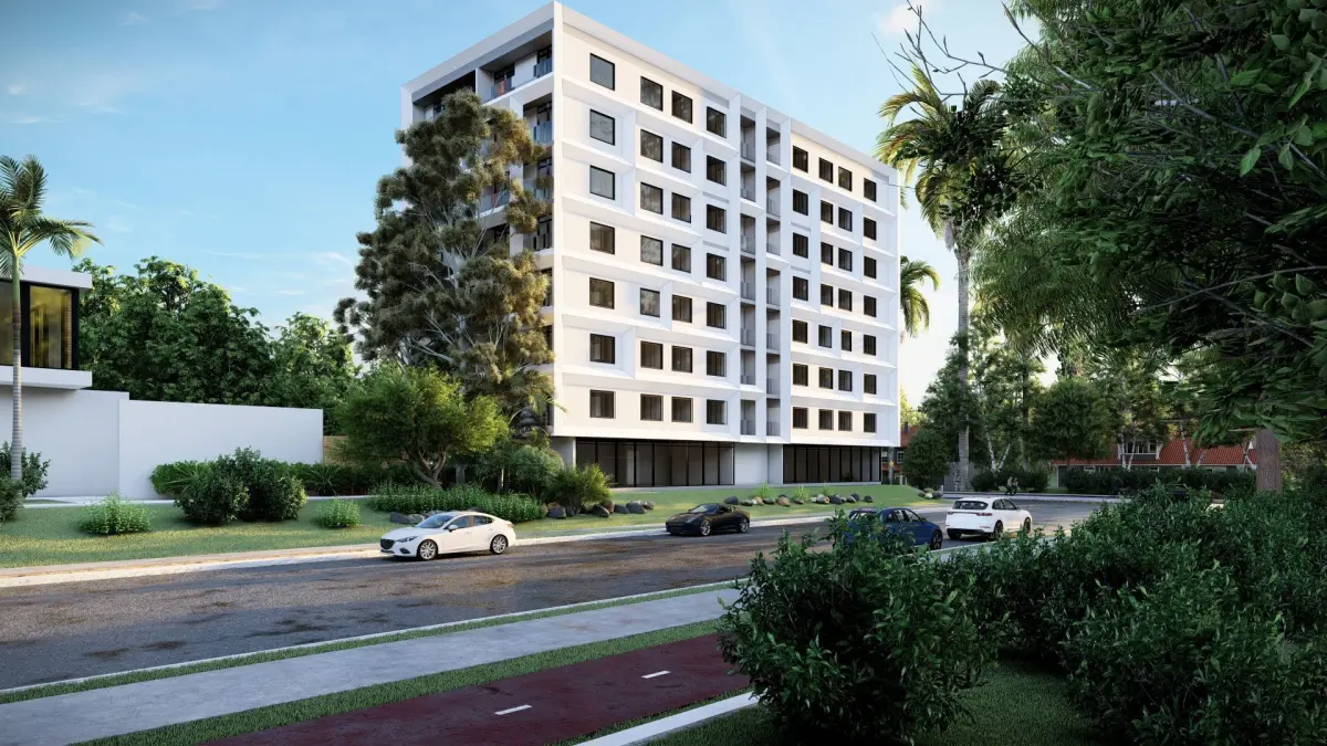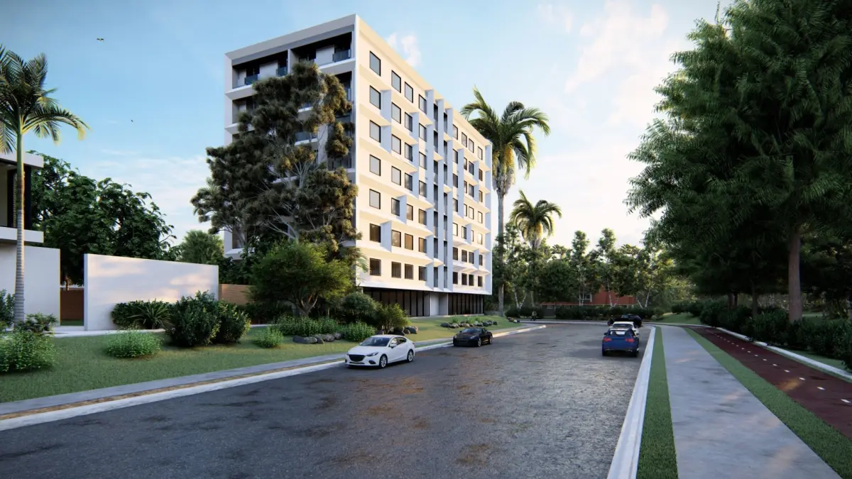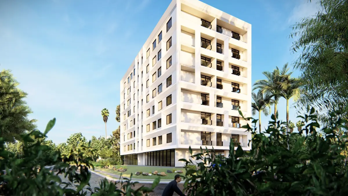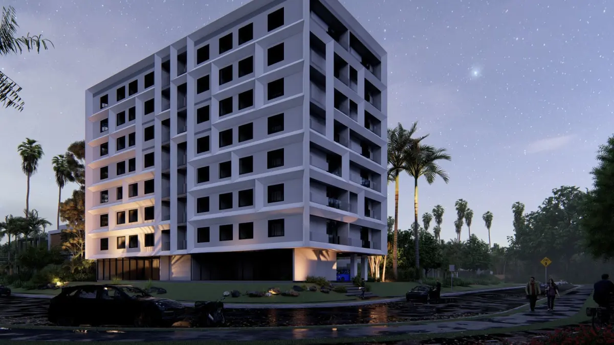 This detailed 3D model showcases a contemporary high-rise residential building, designed with clean geometric lines and modern aesthetics. The facade features a unique repetitive pattern of square windows, creating an elegant play of shadows and light. The structure includes multiple floors with spacious balconies, perfect for architectural visualizations, real estate marketing, and urban development projects. Ideal for use in professional renders or interactive applications, this model adds value to any residential or commercial real estate project. Compatible with all major 3D software platforms.