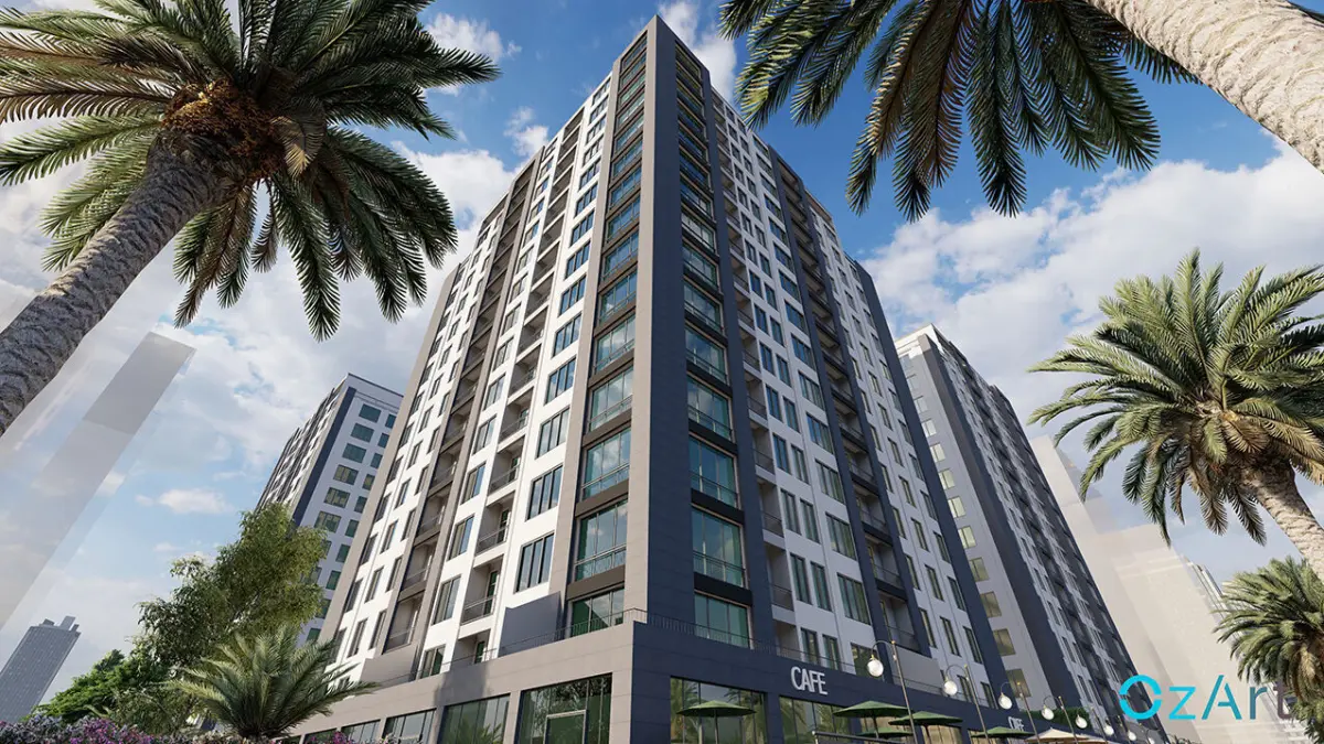 This is a high-quality, photorealistic 3D model of a modern residential building complex, designed with realistic materials, proportions, and lighting. The model features detailed apartment facades, large glass windows, balconies, and a ground floor commercial unit labeled as CAFÉ, ideal for visualization in architectural projects, urban planning, or real estate presentations.