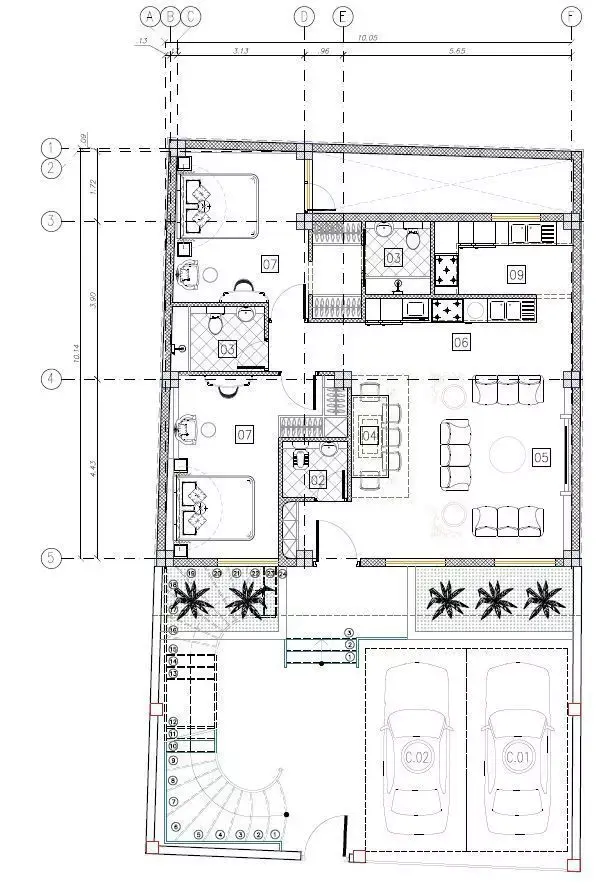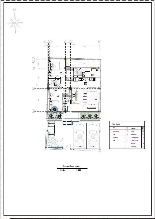 Modern Residential Ground Floor Plan with Parking, Kitchen, and Living Spaces