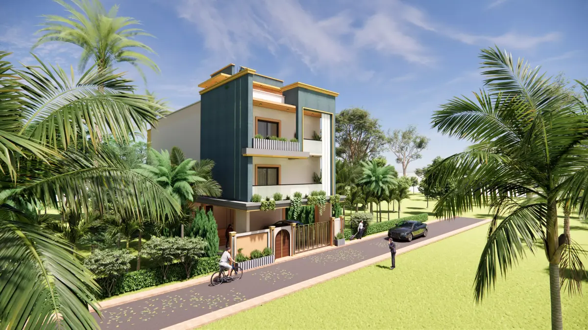 This is a modern independent residential house 3D model designed for small to medium-sized plots.