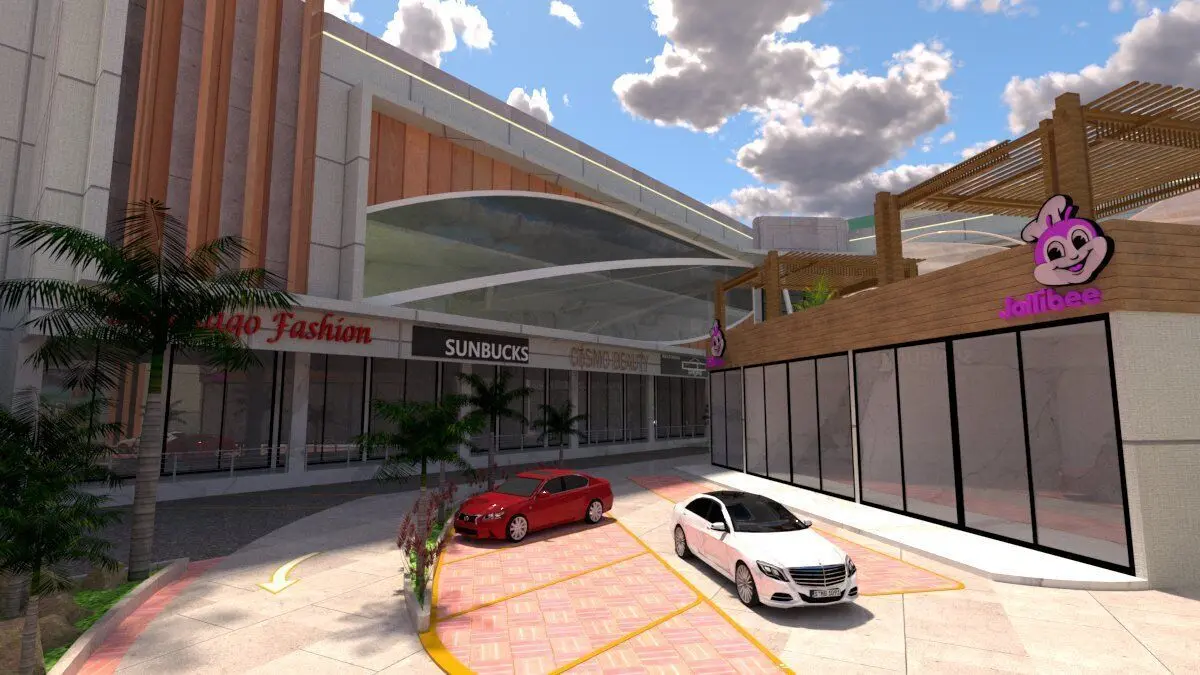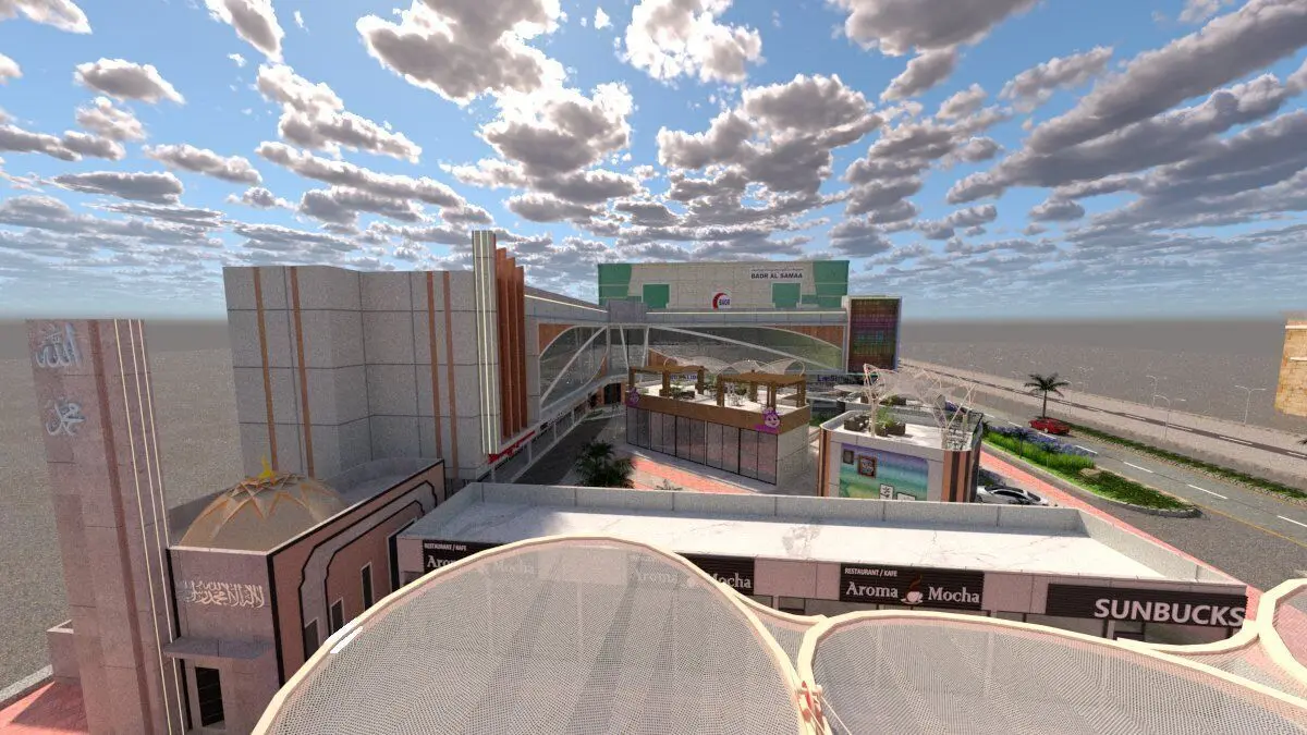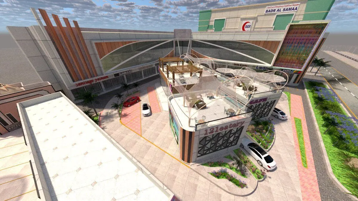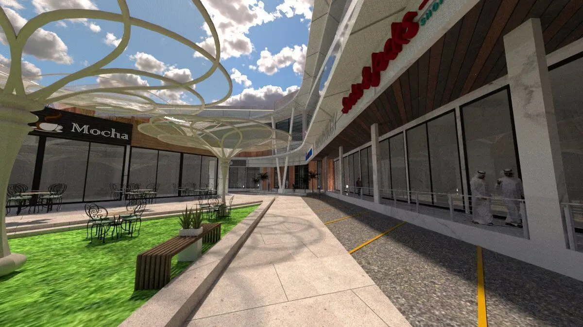 Architectural design for a contemporary retail and commercial strip featuring multiple storefronts, green walkways, and elevated terraces. Includes DWG plans and detailed 3D SketchUp model. Suitable for shopping zones, mixed-use developments, and commercial hubs.
