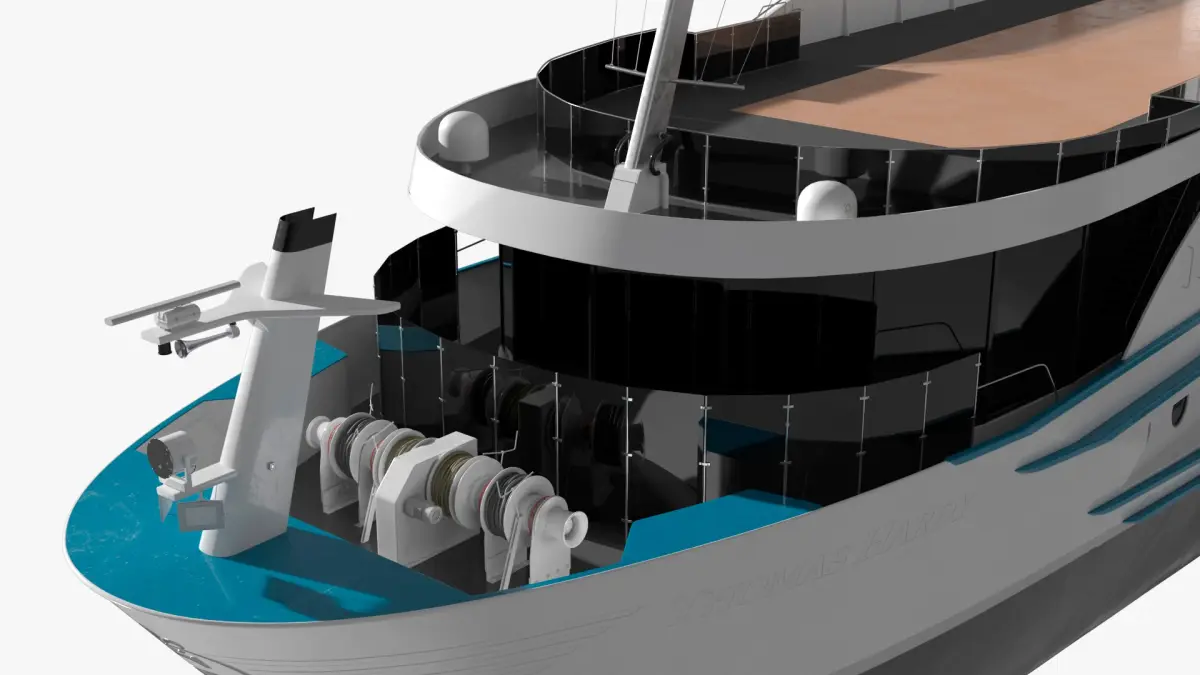 This ship features a streamlined design with multiple decks, large panoramic windows, and an open-air top deck. It includes state-of-the-art amenities like a viewing lounge, fine dining areas, and a small pool or jacuzzi, offering a comfortable and elegant experience for travelers. The ship's design emphasizes both functionality and style with a focus on passenger comfort and efficiency in navigation.