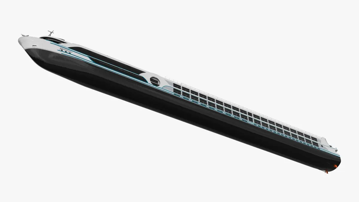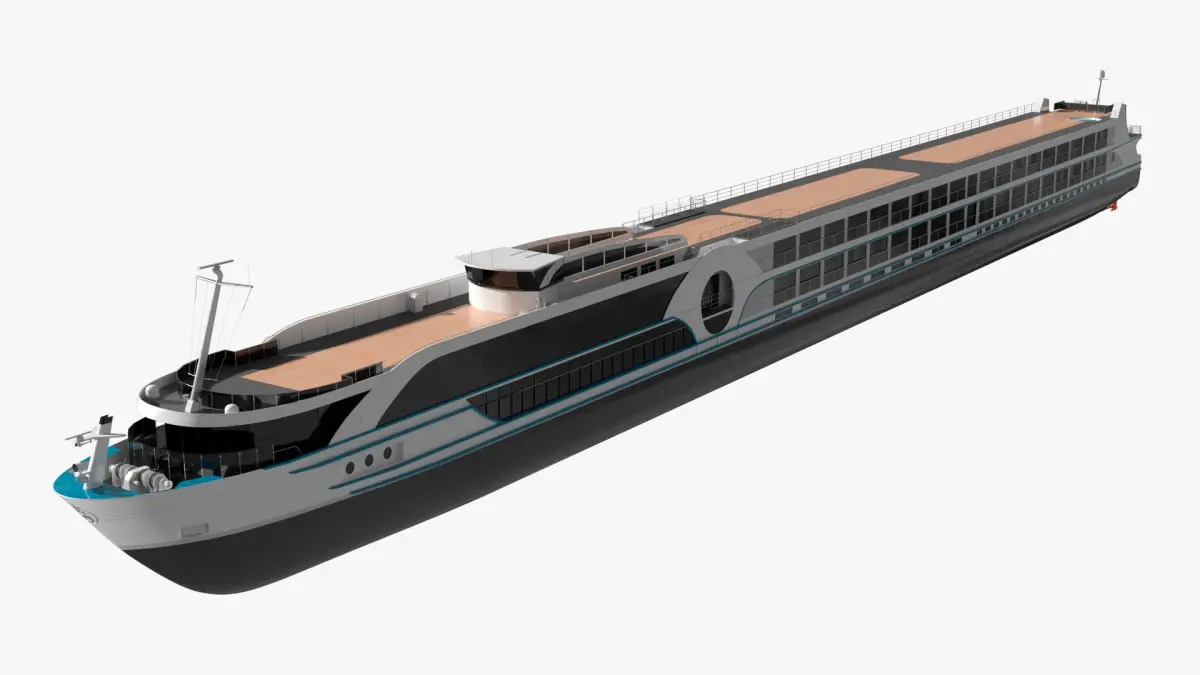 Modern River Cruise Ship White Simplified is a 3d model of a sleek, modern river cruise vessel designed for luxury and leisure travel along scenic waterways.