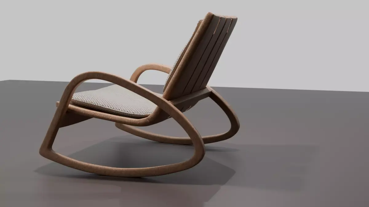 Modern wooden rocking chair set against a dark, monochromatic brown background.