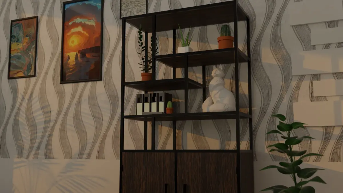 There are 3 portraits, 6 flowers, an armchair, a bed sheet, 2 pillows, a table, a carpet, a curtain, a cat statue, books and a lamp in the room.