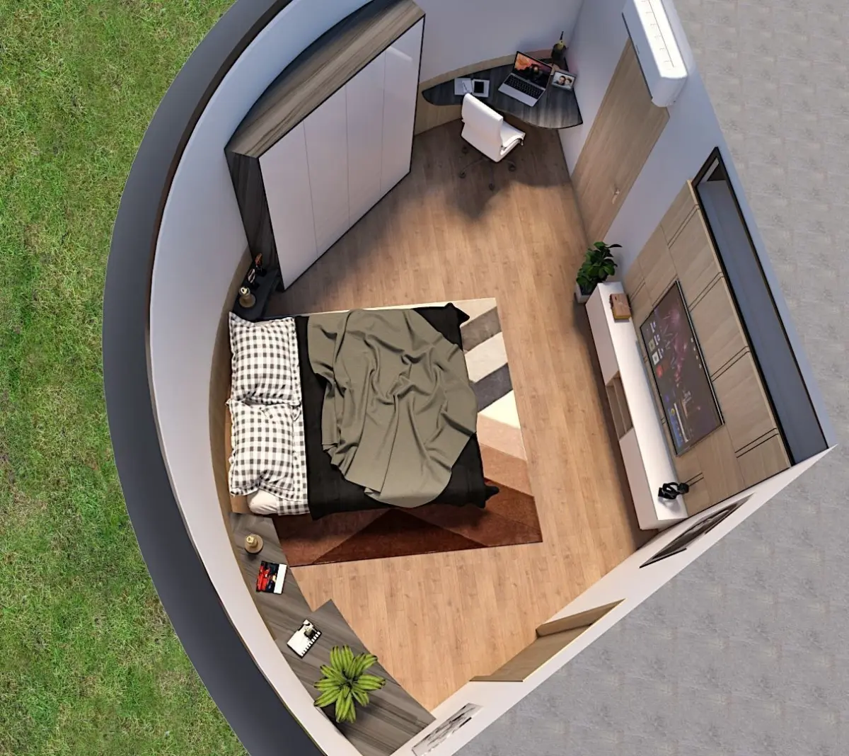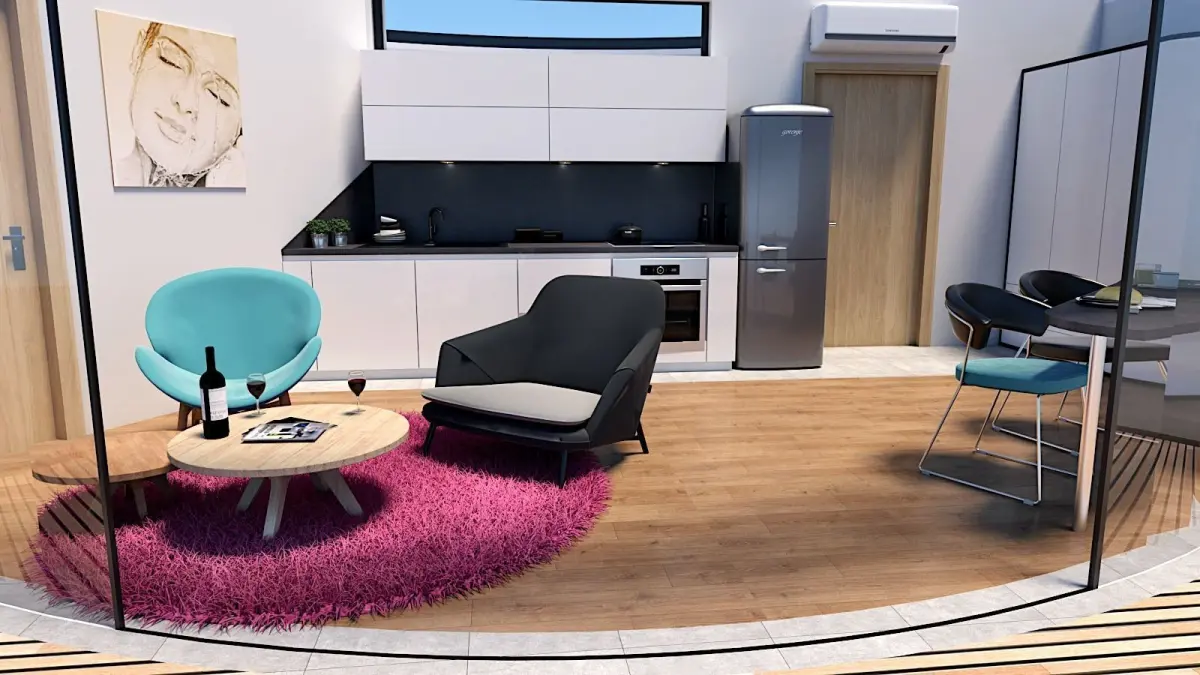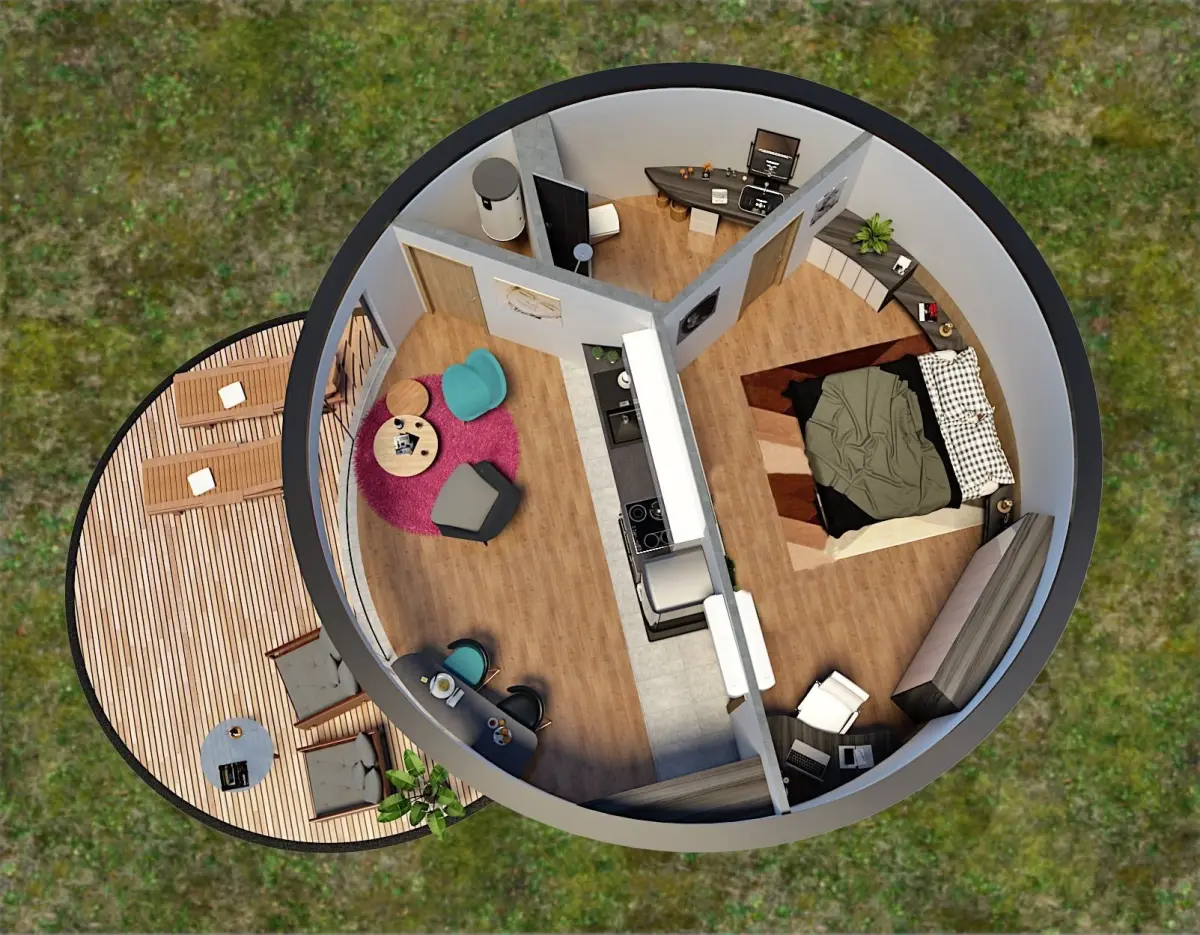 Modern , completely finished ,fully furnished round shape glamping pod /mobile home/vacation house/tiny house with terrace. Modern designed GLAMPING UNIT/POD with terrace, bedroom/living room,bathroom- toilet/shower, and unique designed partial glass wall and wooden planks facade... Unique designed,highly detailed model with lot of useful 3D models such as pots,rugs,bathroom accesories ,kitchen decor, living room decor, tv set decor,lounge chairs, plants and furniture in it and lounge on terrace..Model contains all the furniture in living room/bedroom, bathroom and terrace ;outdoor furniture,sofa,bed,closet,rug,coffe table,shower, sink,faucets,.Different facade variables are possible . Also feature a paintings from my friend. On thefront of the house ,there is round and nice terrace .Suitable for sea site area ( kamping) as for the mountain areas. Model is done with sketch up 2019 pro and rendered with v-ray 4. All textures appliances and furniture equipment is in high resolution,have been checked and are included in scene.Model is easy to manipulate and ready to render with v-ray. Real world scale and exact proportions cm. Realistic and correctly scaled ! • Excellent polygon & texture efficiency Purchasing this model , you get files in different formats as :skp,obj ,lumion 8 ,or ask designer for different formats. 3DS max users can use sketch up ,2008 file formath , that i can provide.Additional Textures provided with the model:Normal Maps; yes Diffuse Maps; yes Textures; yes Materials; yes U.V maps; yes Checked that normals are facing correctly; yes Blendshapes; no Rigged; no All quads no triangles ;yes 3D printable with STL. ; no If you have any additional questions or requests about the model, don't hesitate to contact us with your inquiries.