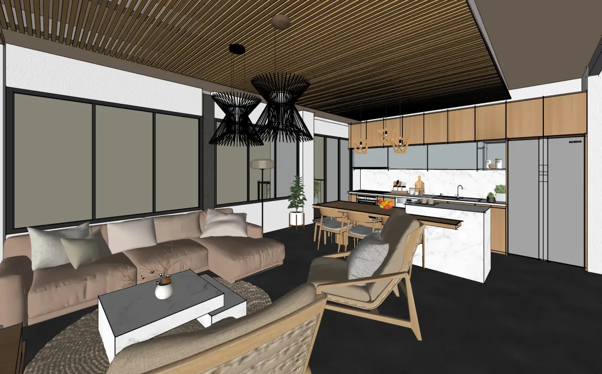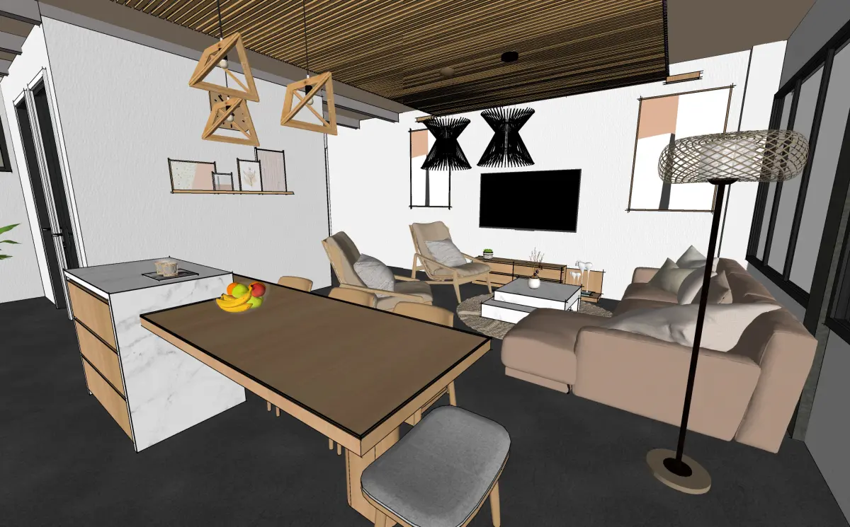 Bring a warm, lived‑in aesthetic to your next arch‑viz shot, VR walkthrough, or real‑time design review. This open‑plan apartment blends Scandinavian simplicity with rustic texture. Think slatted teak ceilings, Calacatta‑style marble, soft linen upholstery, and matte‑black metal accents—all optimised for smooth navigation and quick edits in SketchUp.