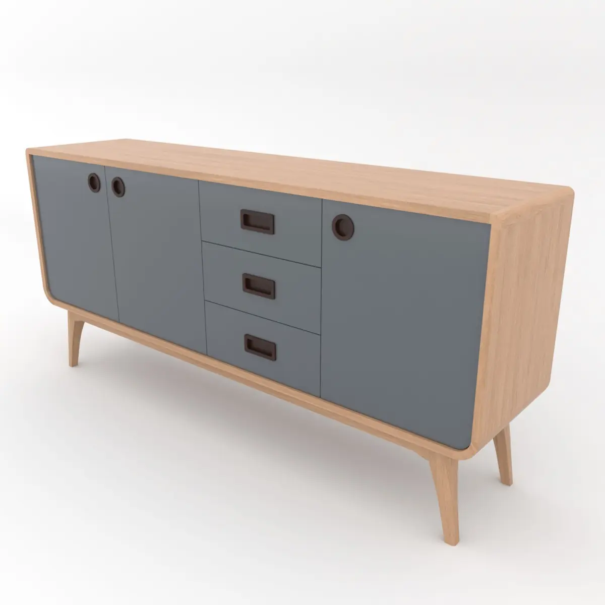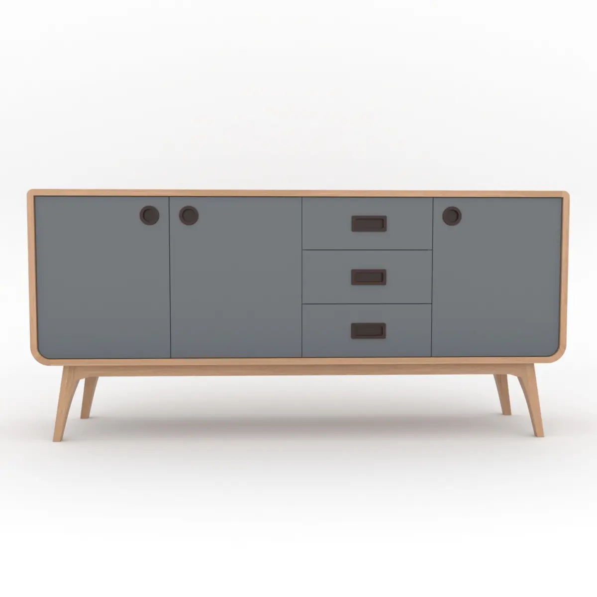 This stylish Scandinavian-style TV console features a minimalist design with soft curves, tapered legs, and a clean finish. Crafted with a natural light wood frame, it combines functionality and aesthetics through its elegant steel-gray solid-colored cabinet doors and drawer.