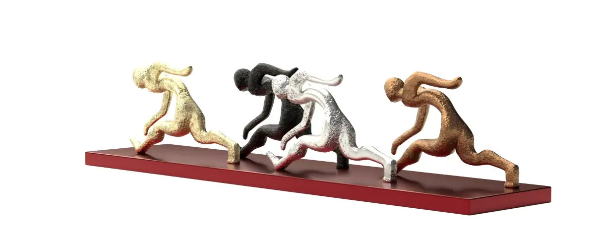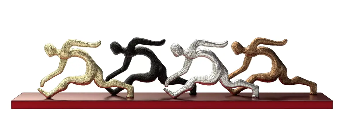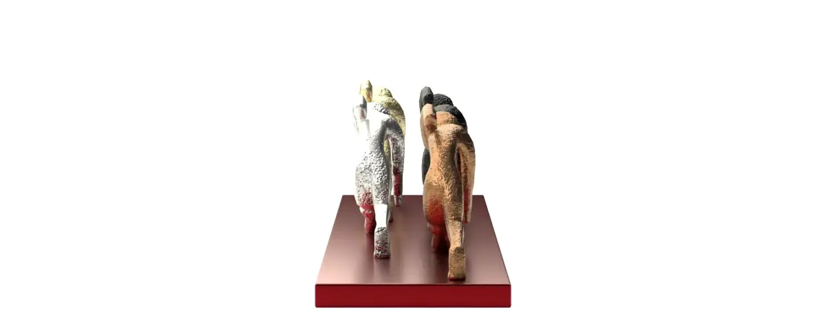 This Modern Sculpture Metal Art Decoration Blender 3D model features abstract runner figures designed with metallic finishes in gold, black, silver, and bronze, mounted on a sleek red base. The artwork symbolizes movement, energy, and determination, making it an excellent piece for interior design, wall decor, office spaces, galleries, and 3D printing projects. Its contemporary style adds a sophisticated and artistic touch to modern environments, blending minimalism with bold elegance.