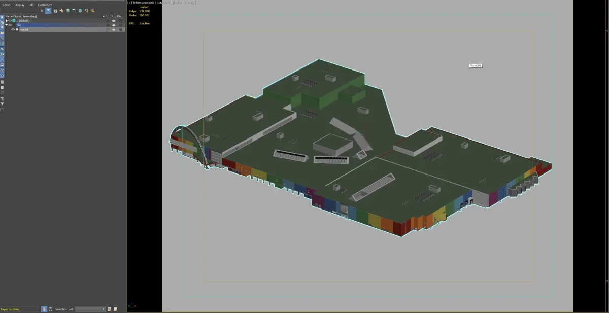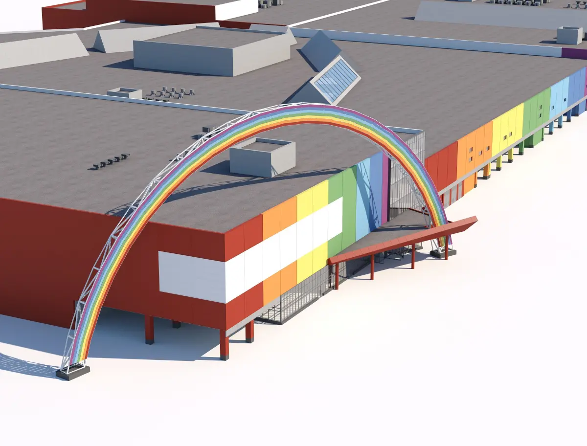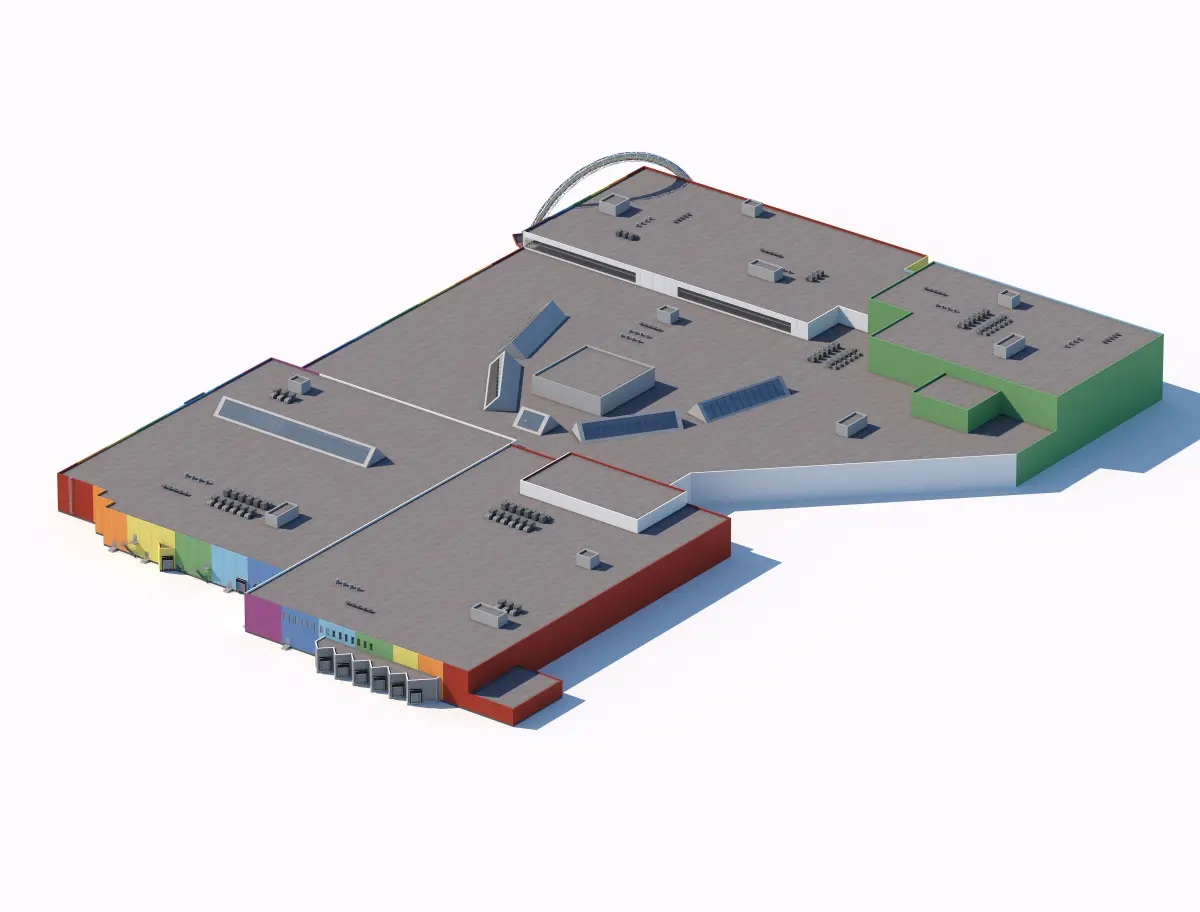 A spacious shopping mall model with a vibrant, colorful facade and detailed rooftop features, perfect for urban development scenes.