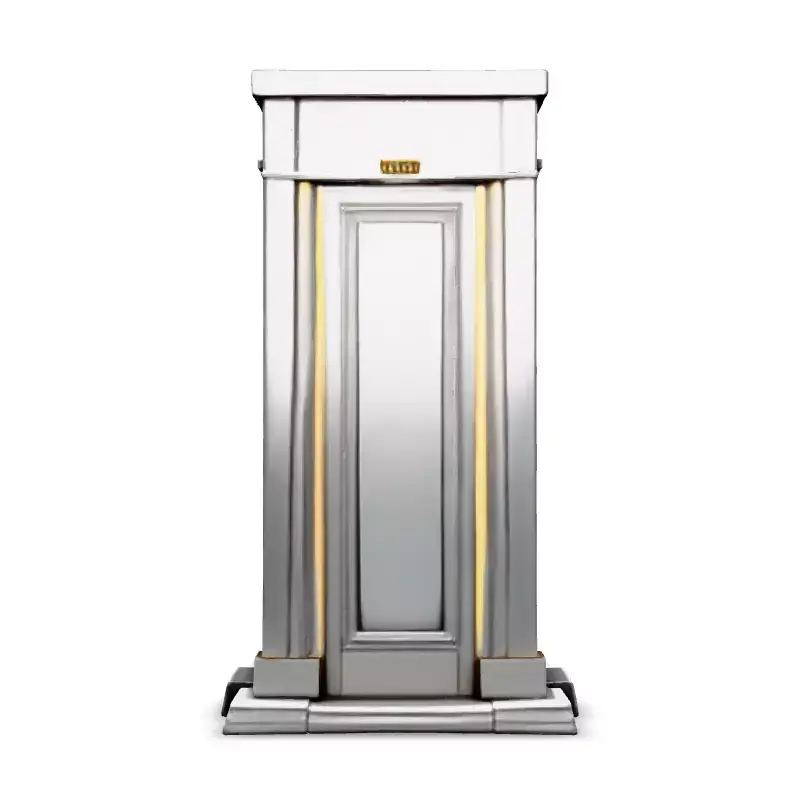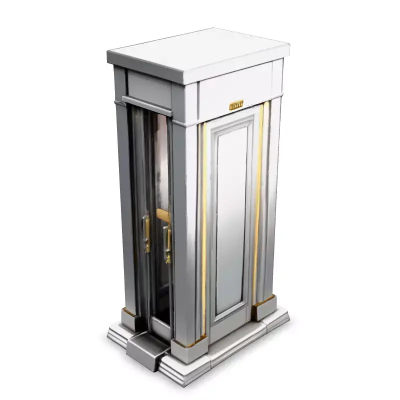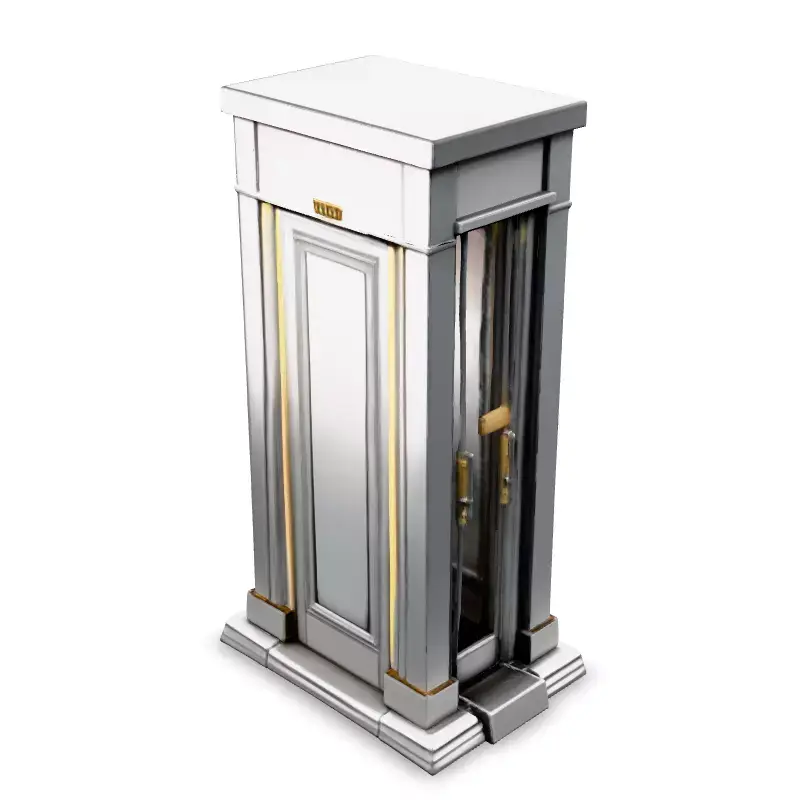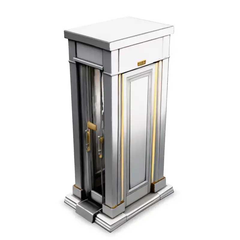 This 3D model depicts a sleek and modern elevator cabin designed with silver and gold accents. Ideal for architectural visualizations, interior design projects, and virtual reality experiences, this model adds a touch of luxury to any scene. It can be used in game development, architectural visualization, or even 3D printing for miniature designs. This model is available in several file formats, including GLB, OBJ, STL, FBX, and DAE. It is optimized for both real-time applications like games and AR, as well as high-quality static renderings. Key features include clean topology, UV unwrapped meshes, and PBR textures, ensuring realistic material representation. The model is ready for subdivision for higher detail if needed. The design is highly detailed yet efficient, allowing for seamless integration into various projects. The elevator features a polished silver exterior with elegant gold trim. The door is slightly ajar, revealing a gold interior, hinting at the opulent space within. This model adds a touch of elegance and modernity to any project, enhancing the overall aesthetic.
