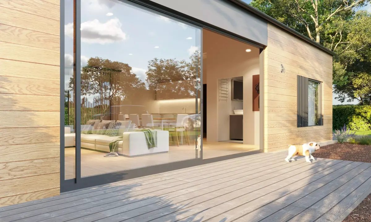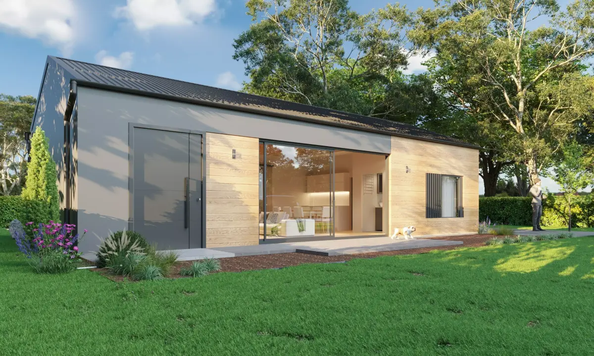 Style: Modern / Minimalist / Contemporary Features: Wooden cladding façade, large glass doors, flat landscape lighting Best for: Architectural visualization, prefab home marketing, 3D learning references