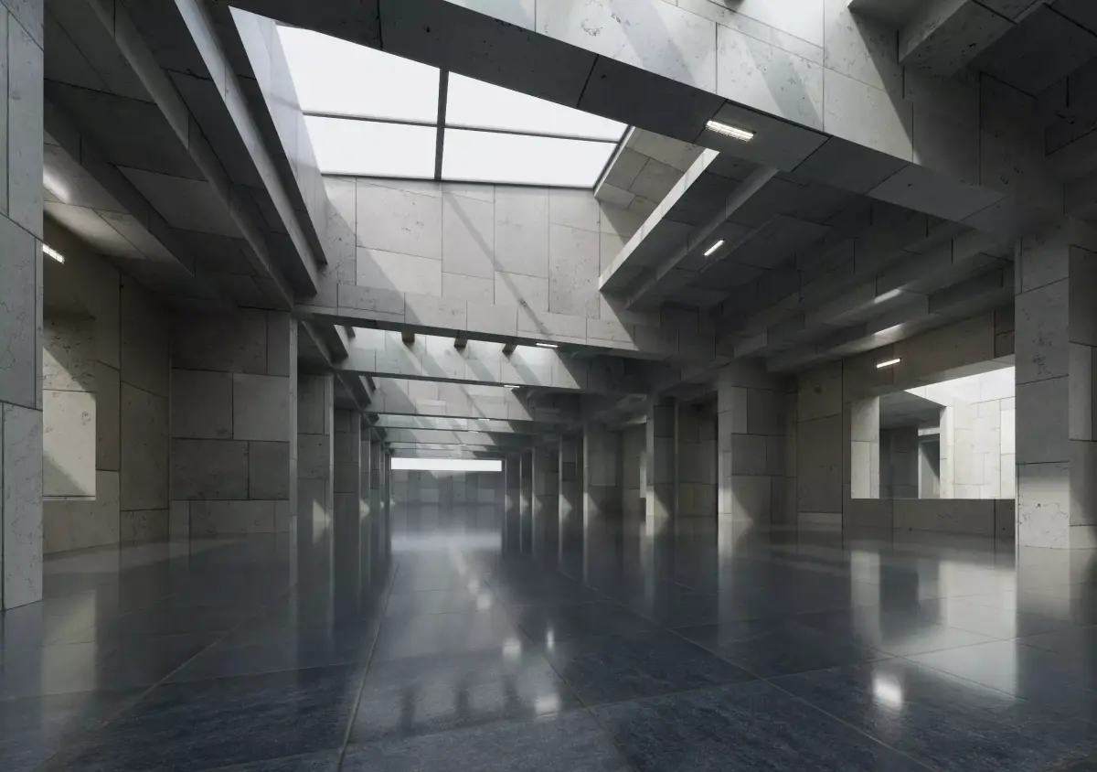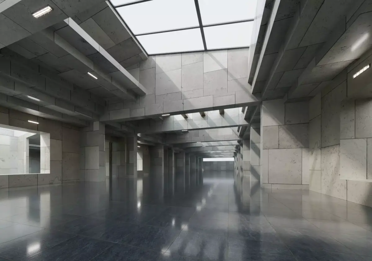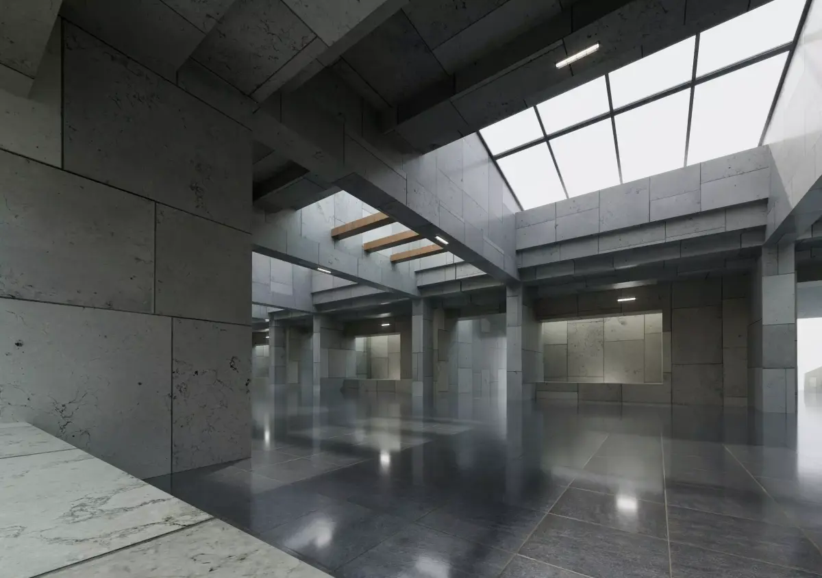 - Ultra-realistic concrete hall with layered skylights