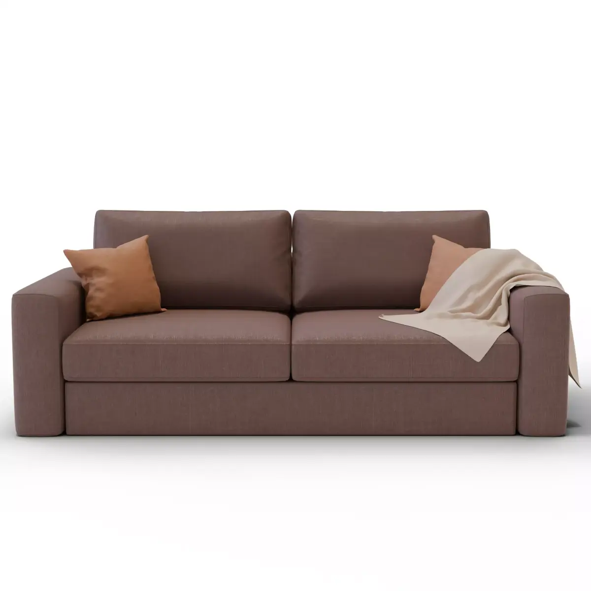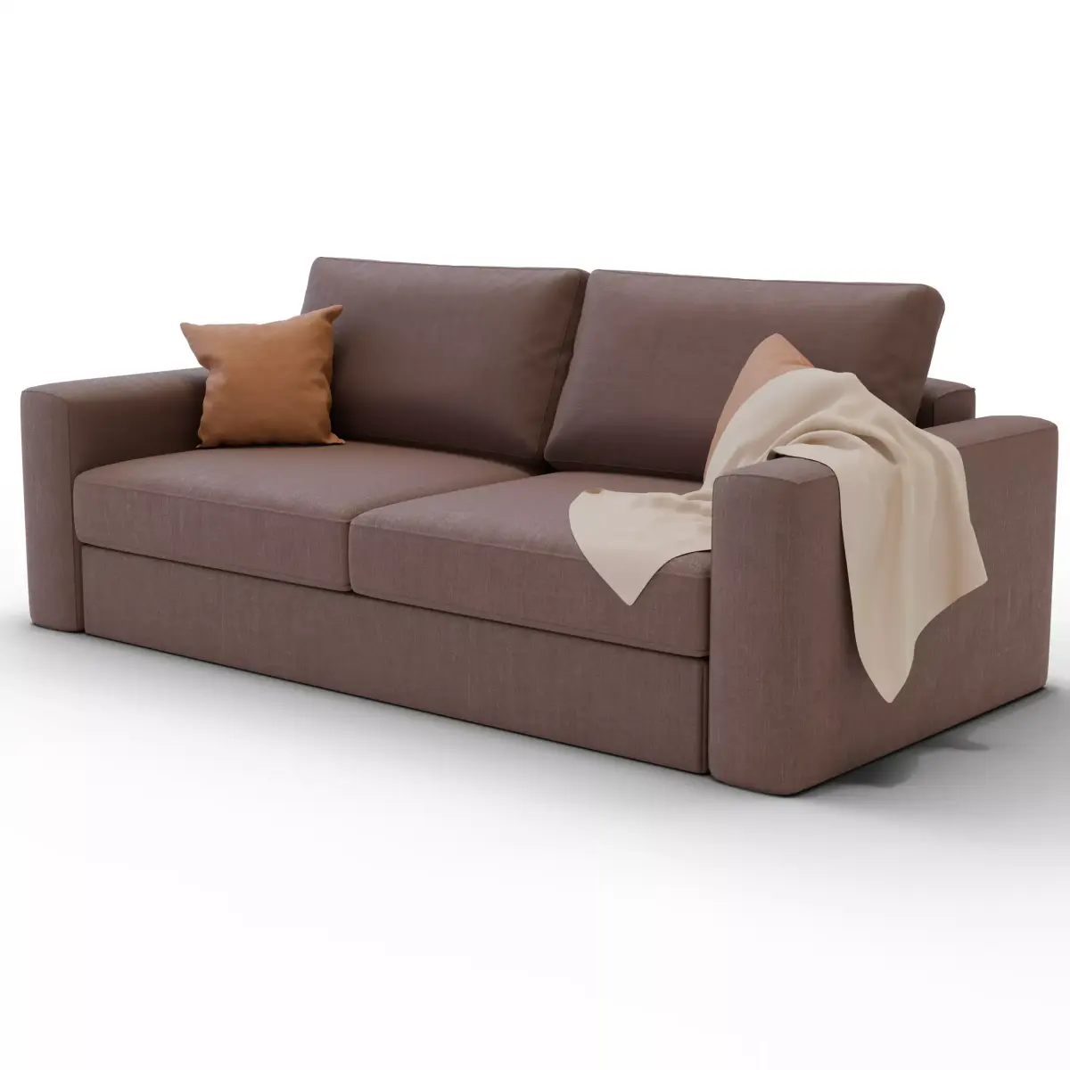 This is a high-quality 3D model of a modern sofa, suitable for interior render scenes and close-up visualizations. The model is presented in a warm brown color palette with fabric materials, complemented by pillows and a blanket for a realistic appearance. All measurements are in centimeters, and the model is centered in the coordinate system.