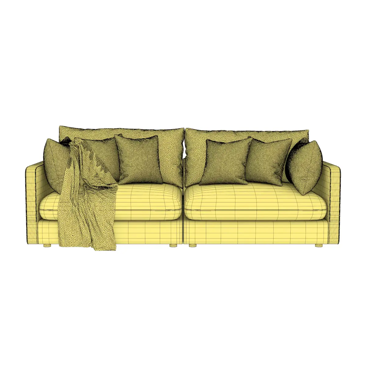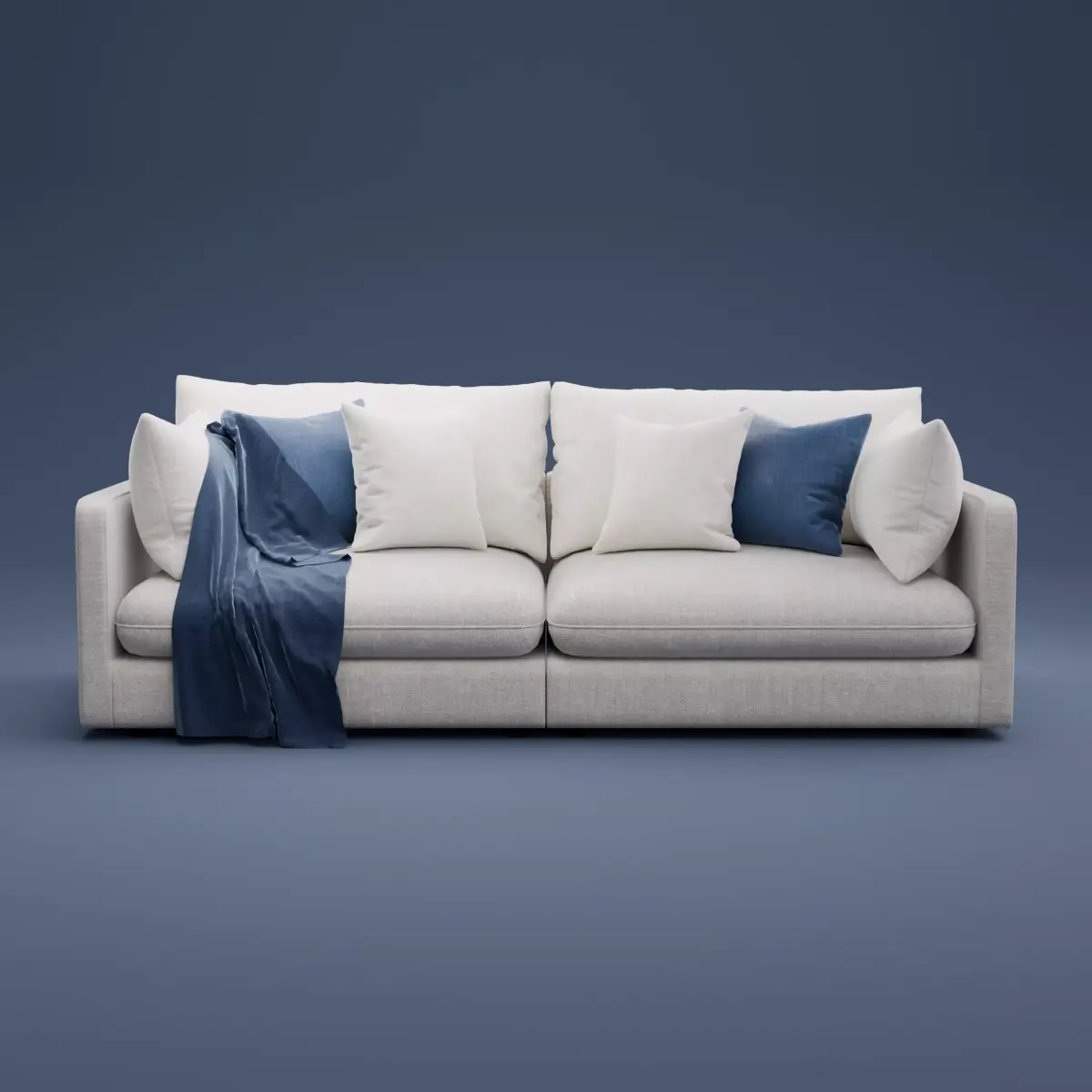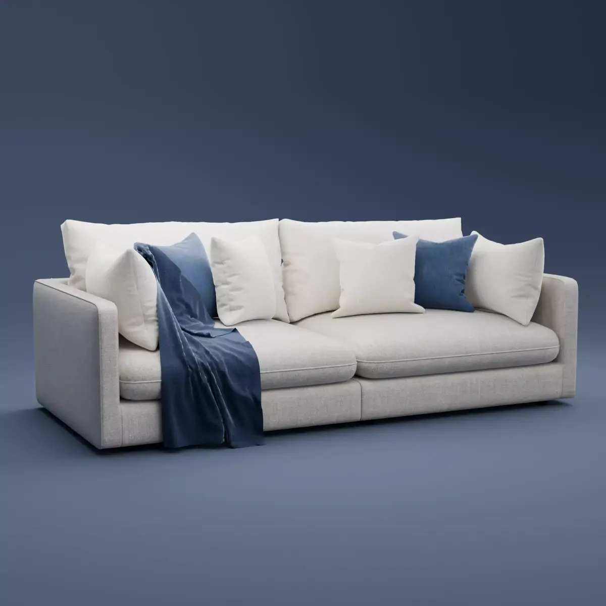 This modern sofa model is designed for high quality interior visualization. The geometry is detailed and suitable for wide shots and close up renders. All dimensions follow real furniture proportions and use centimeters. The model is placed at the center of the coordinate system and is ready for quick scene integration. Fabric textures are included with clean UV mapping. The light neutral color set fits easily into different interior styles. Cushions and the throw add realism for living room scenes and studio renders.