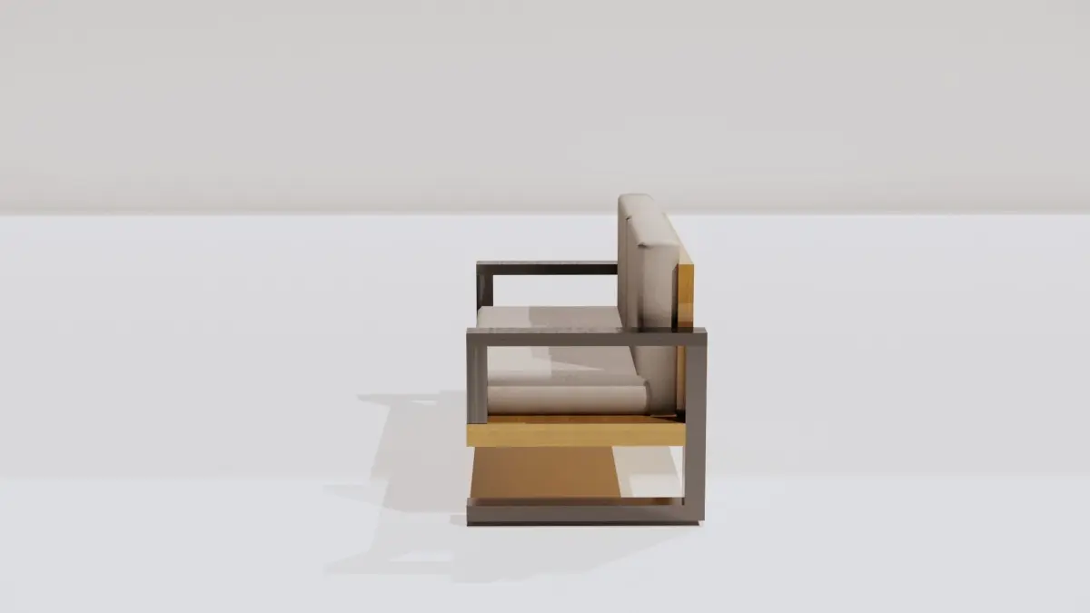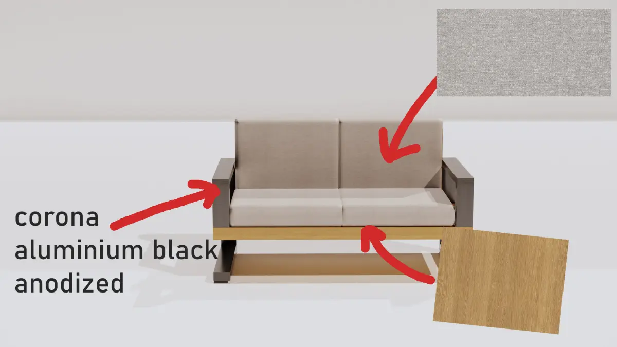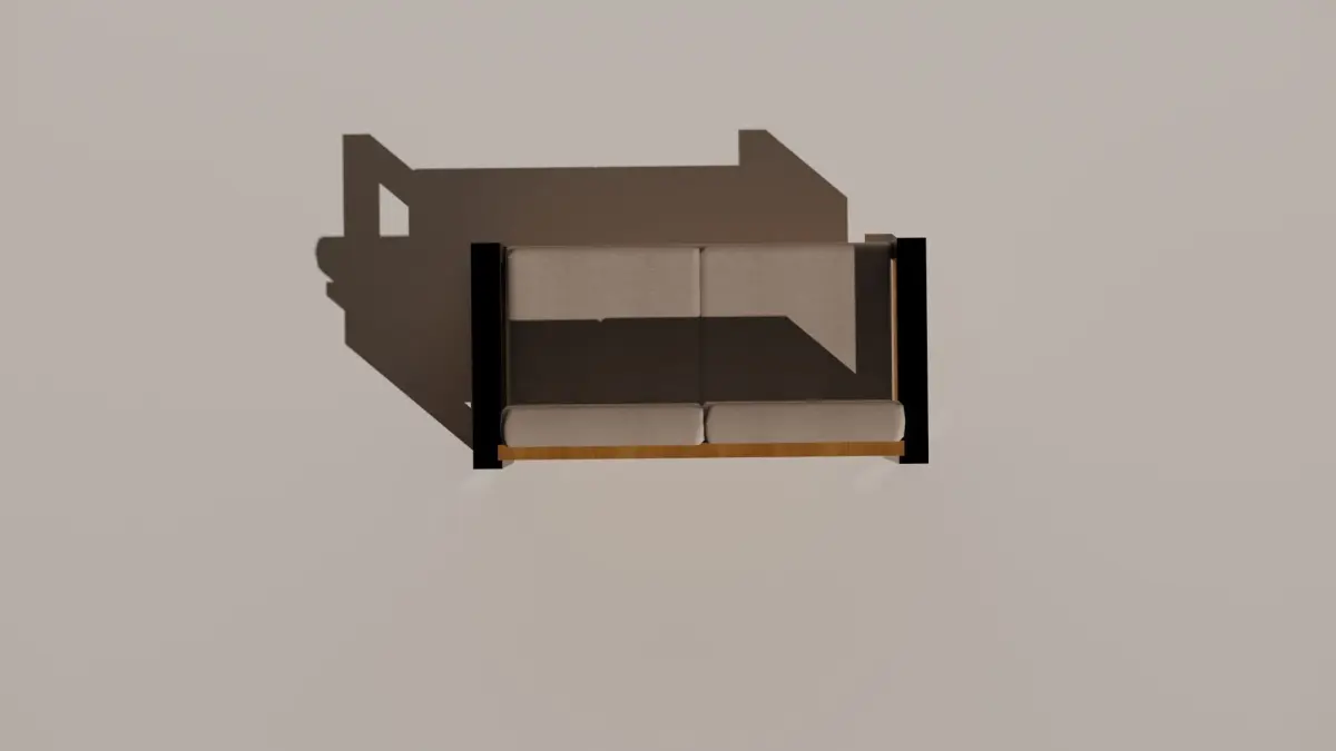 Sofa with wood bottom and wood back. Cushions are made from light-grey cloth. The sofa is a bit large:)