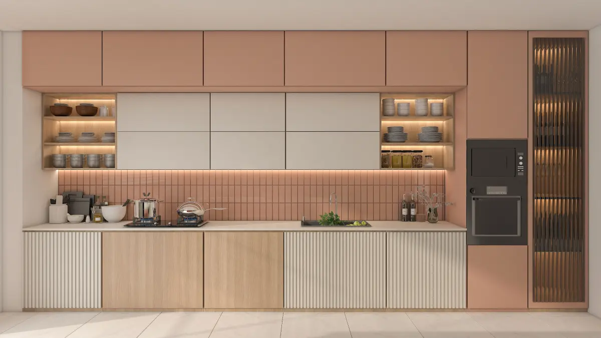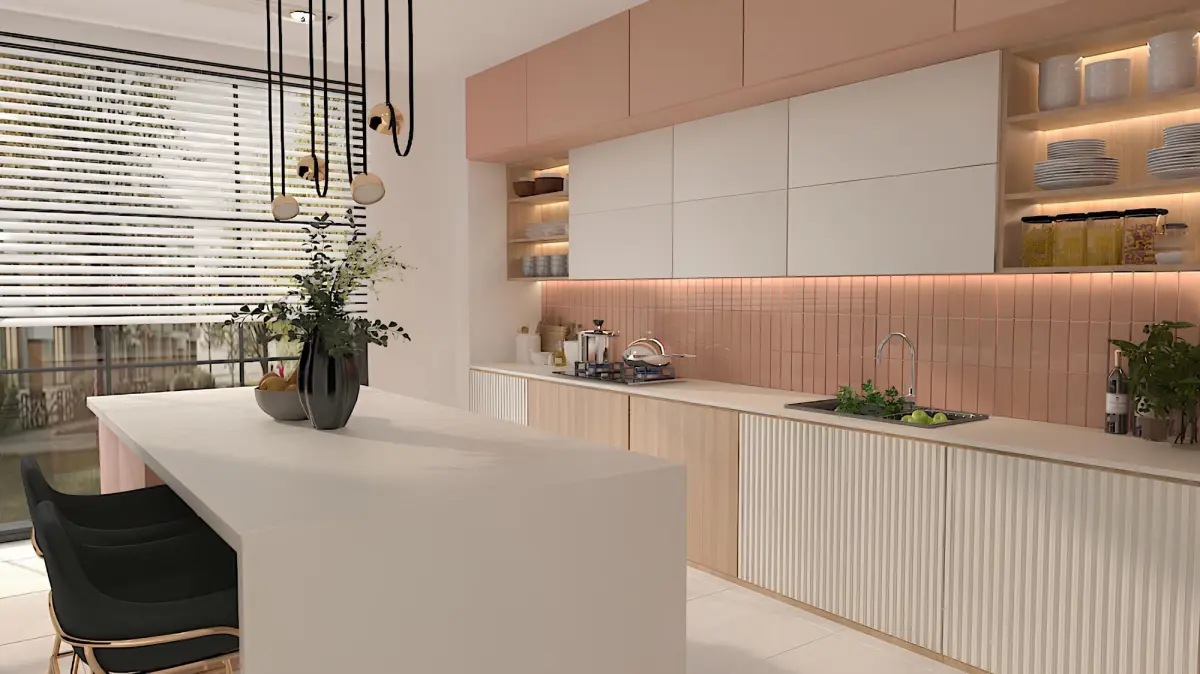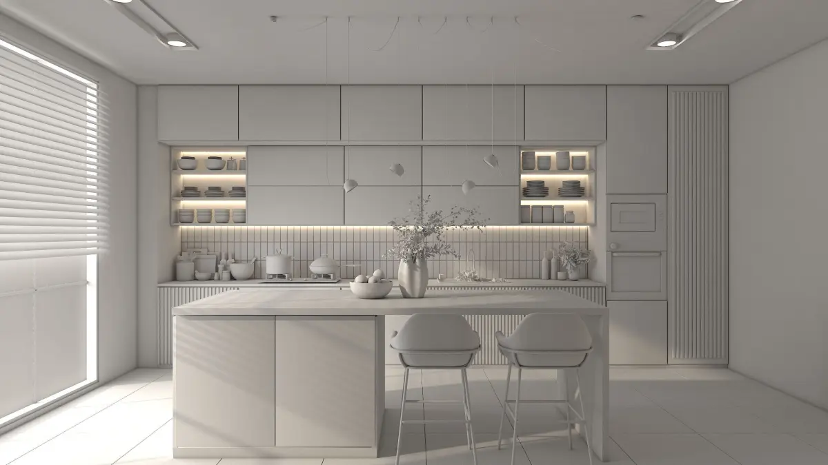 This is a high-quality modern kitchen interior scene designed with a soft and elegant aesthetic. The model was created in 3ds Max and rendered with V-Ray. It includes detailed furniture, kitchen accessories, and a beautiful light setup — perfect for photorealistic renders, concept design, or interior animations.