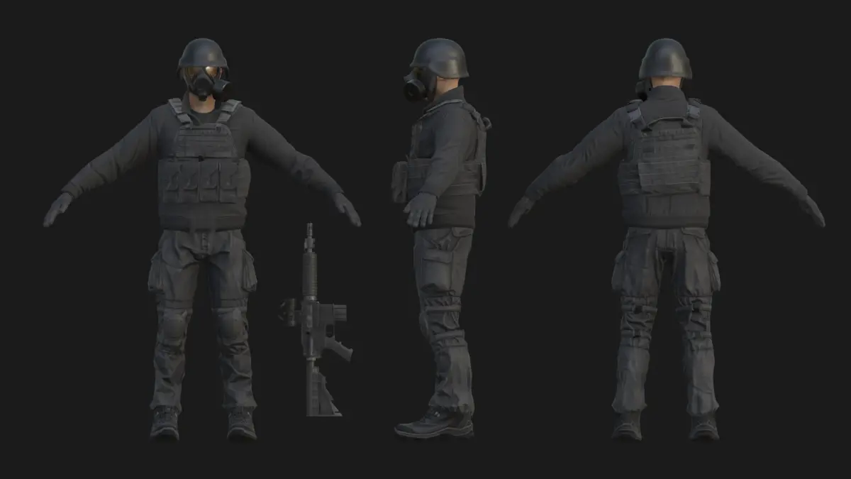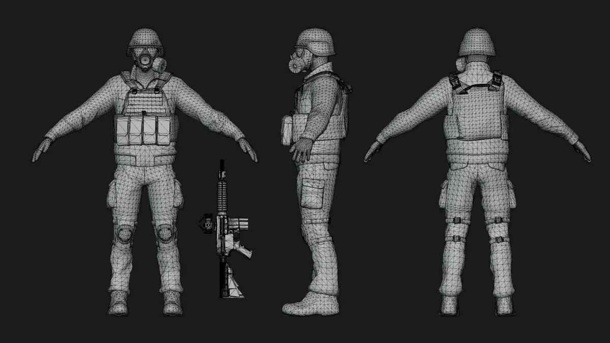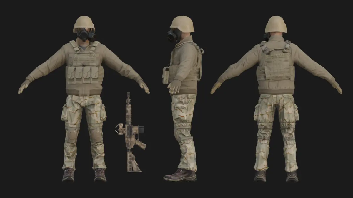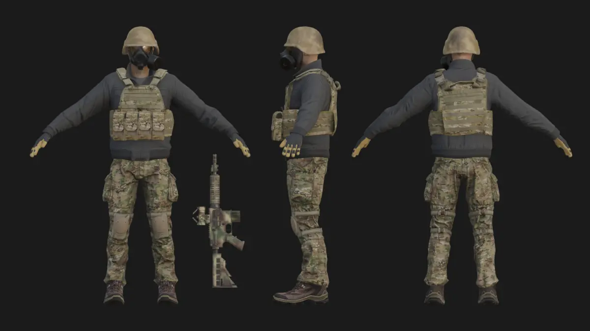High-quality 3D model of a modern soldier equipped with tactical gear, including a gas mask, helmet, and assault rifle. Designed with realistic textures and detailed clothing such as cargo pants, knee pads, and combat boots, this character is perfect for games, simulations, or animations. Fully rigged and ready for use in your project!