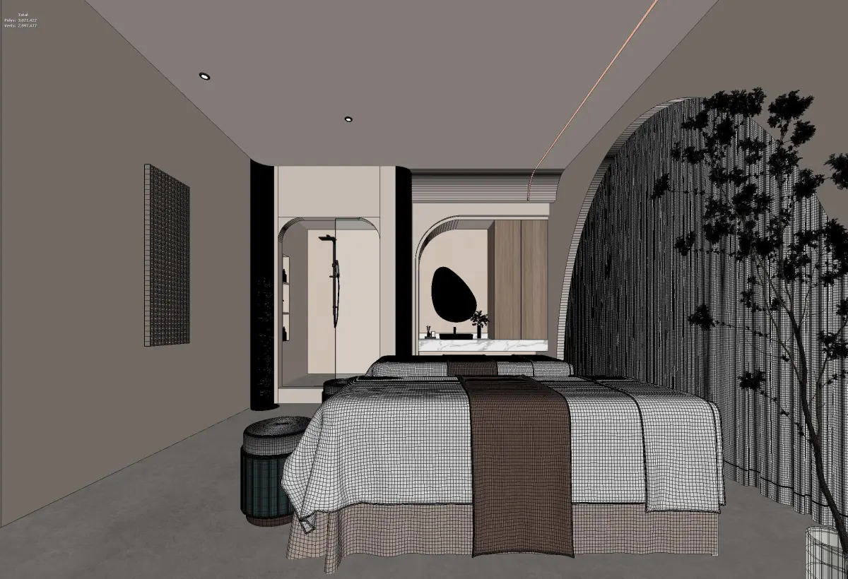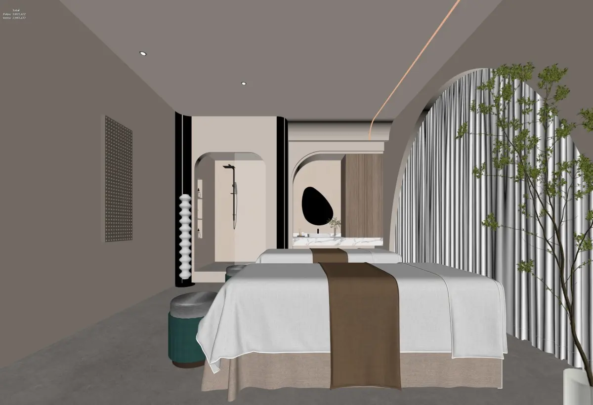 3D model of a modern spa treatment room, featuring massage beds, ambient lighting, minimalist decor, and natural elements. Ideal for wellness and hospitality design, creating a relaxing and stylish spa environment.