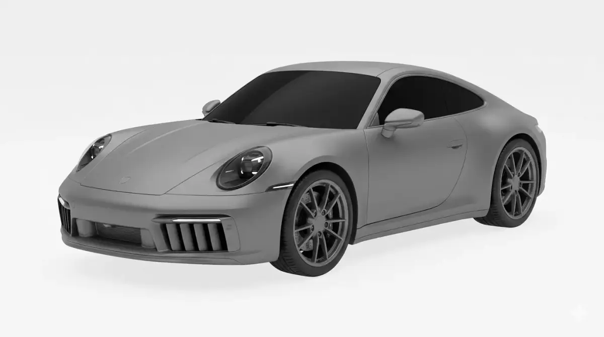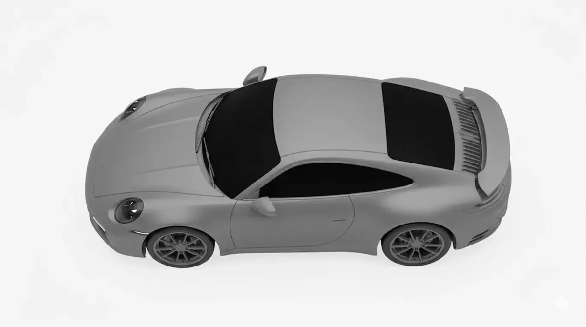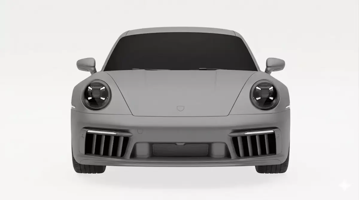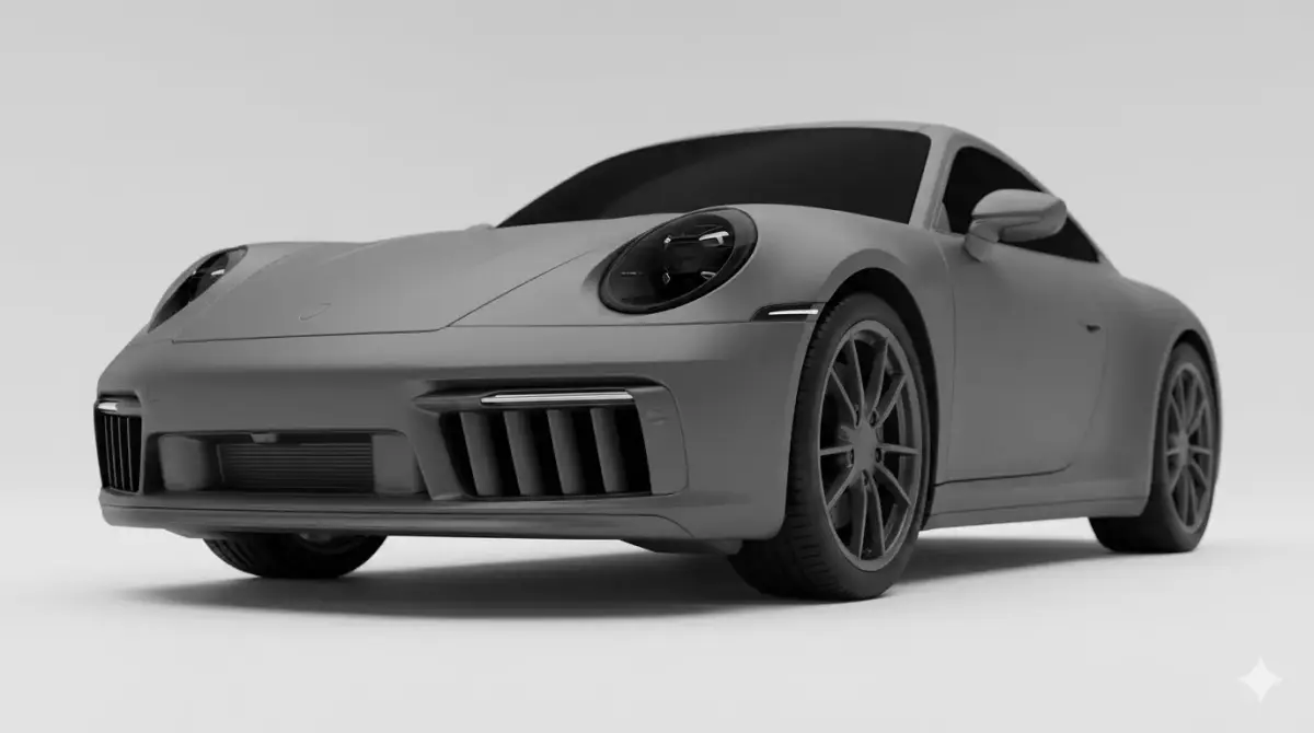 This image showcases a high-quality 3D render of a contemporary sports car, heavily inspired by the iconic silhouettes of high-performance German engineering. Presented in a sophisticated, monochromatic matte grey finish, the vehicle features a streamlined aerodynamic profile with a low-slung stance and distinctive wide rear haunches. The front fascia is defined by recessed circular LED headlights and aggressive vertical air intakes, while the dark-tinted windows add an air of mystery and luxury. Set against a clean, neutral white background, this studio-style visualization emphasizes the car's clean lines, precision panel gaps, and intricate multi-spoke alloy wheels, making it an ideal representation of modern automotive design and digital modeling craftsmanship.